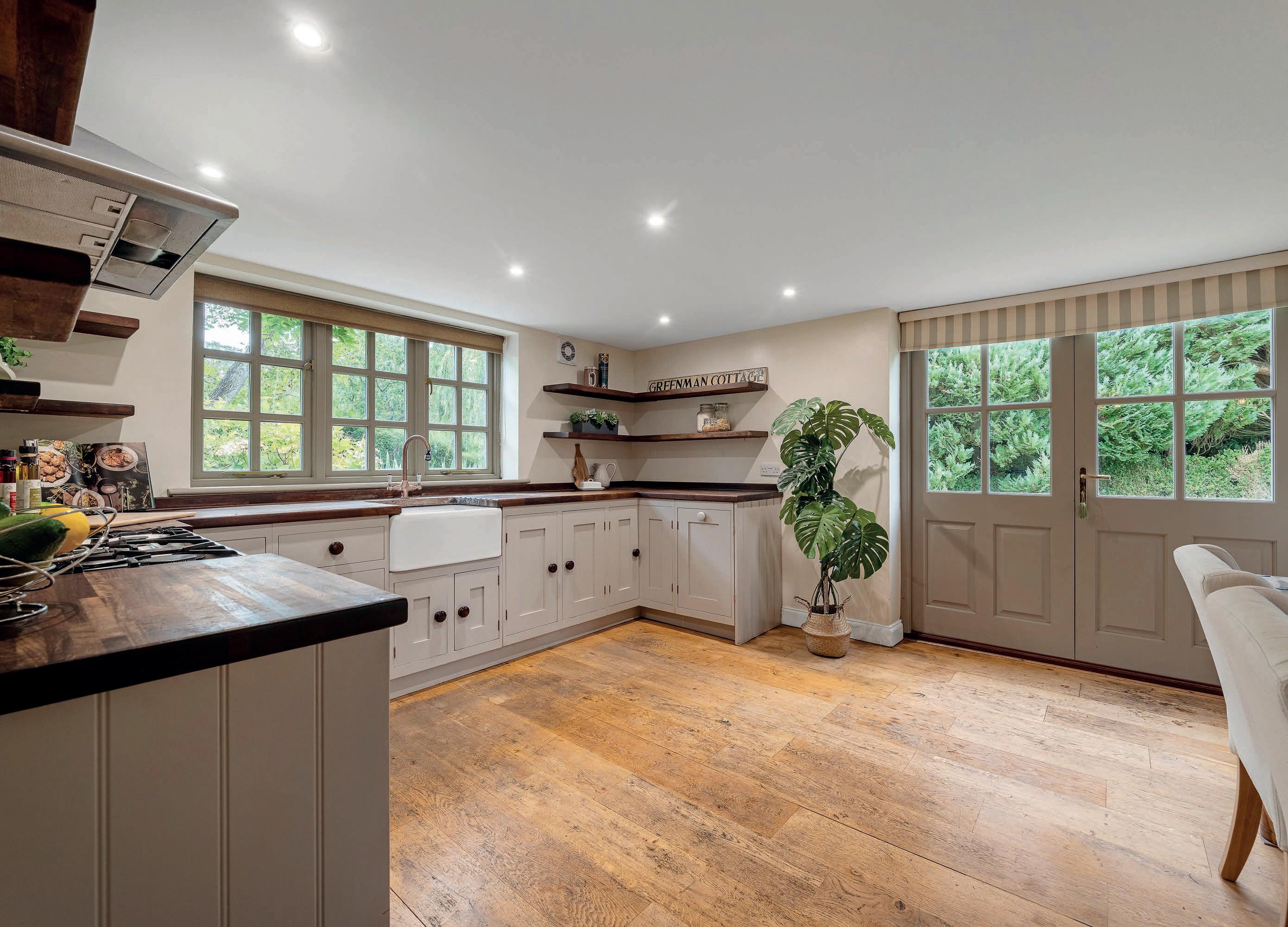 Enter Greenman Cottage through a stunning wooden, arched portico. The wood and glass-panelled front door opens into a spacious, light-filled entrance hall, where your eye is immediately drawn to the French doors ahead, leading out to the secluded country garden. Restored oak floors flow seamlessly throughout, adding warmth and character.