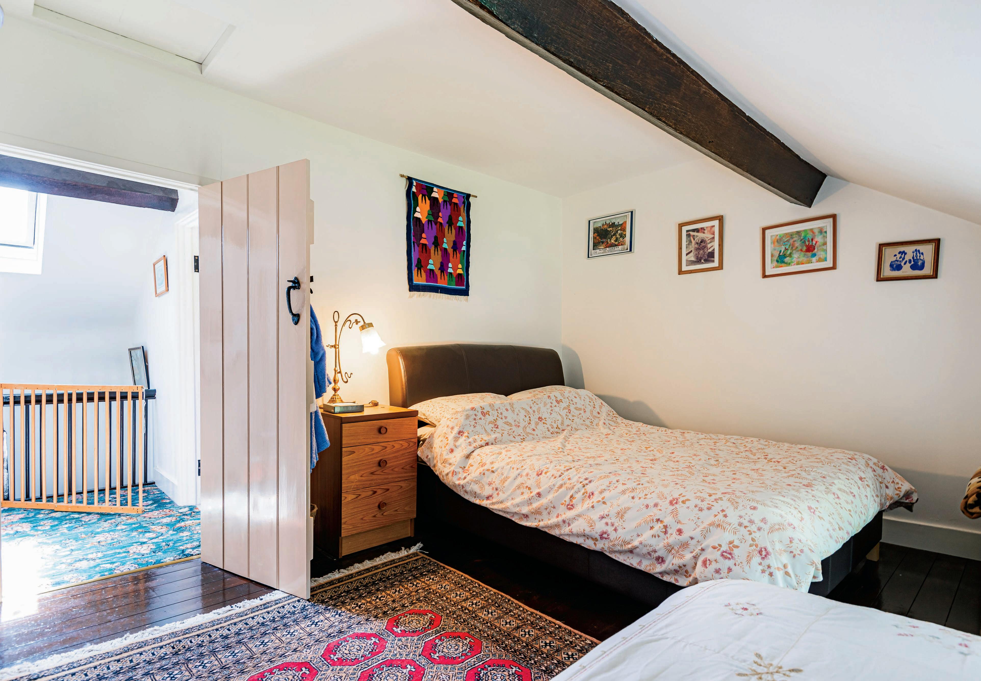 The second floor offers two additional double bedrooms and a bathroom complete with panelling and a Velux window that floods the room with natural light. The larger of the two bedrooms on this floor has an interesting central door leading to a large loft space, which offers further potential for conversion into a luxury en suite or a larger bedroom area.