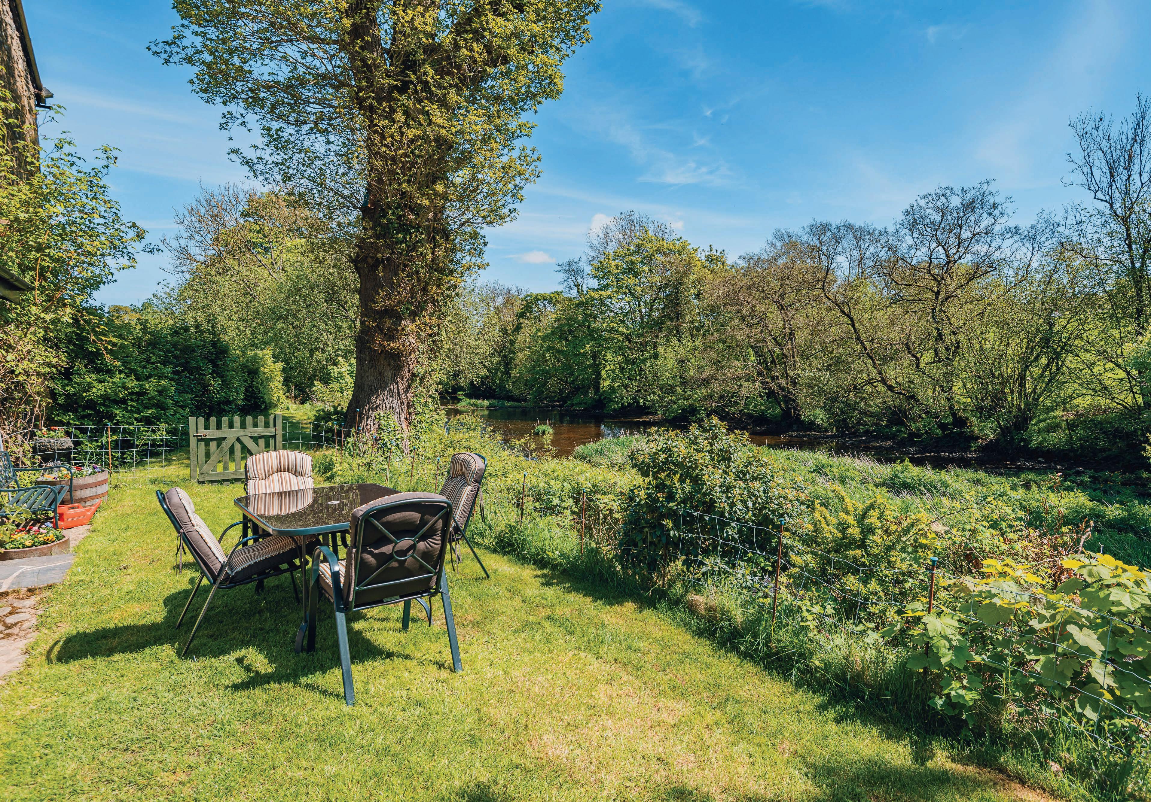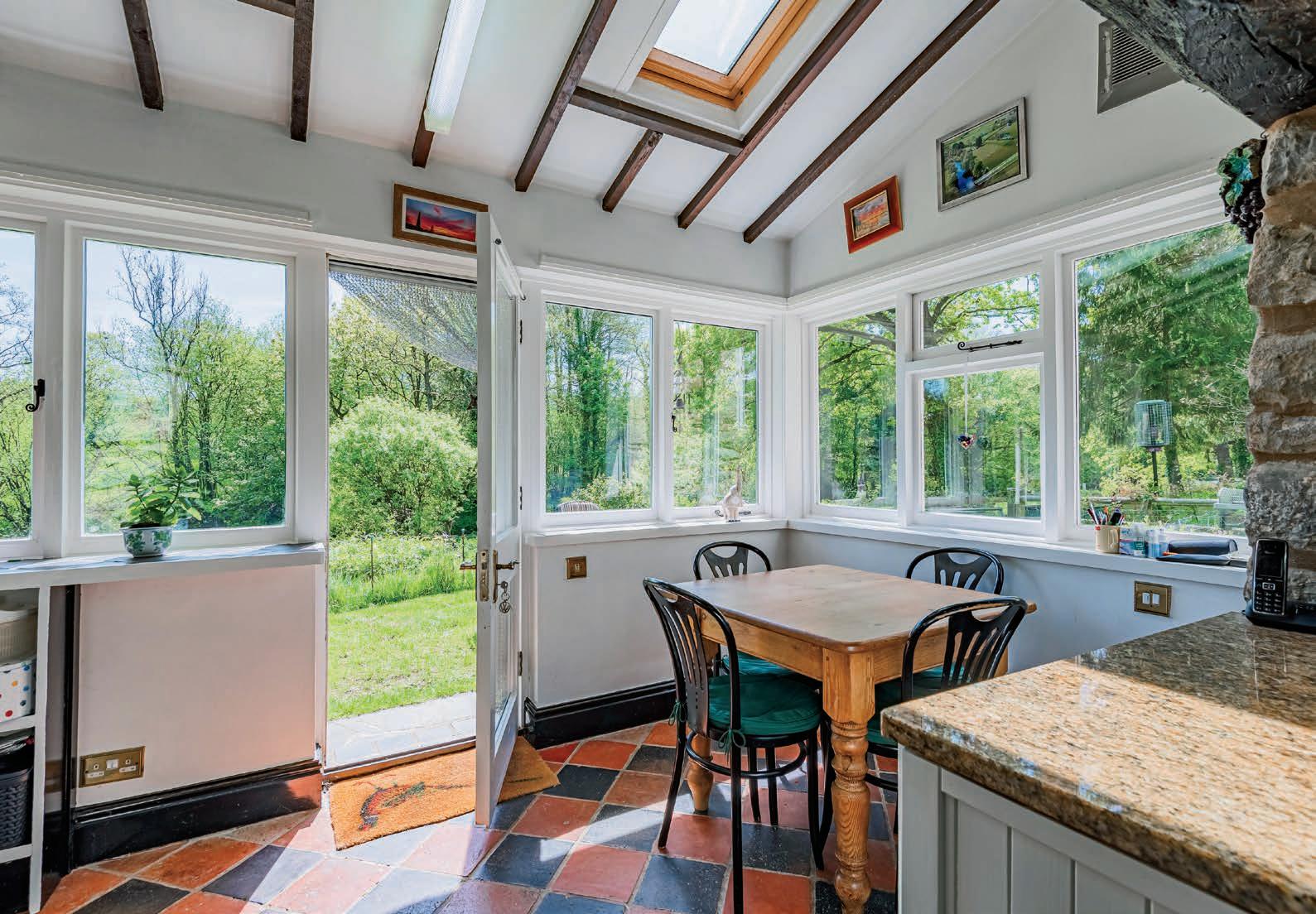 The open-plan kitchen and garden room have been designed to highlight the stunning rear views of the River Banwy and has the leat running beneath it. The kitchen features a Rangemaster, sink and drainer, numerous units with granite worktops, beautiful tiled flooring, and the added bonus of underfloor heating. An exposed stone opening leads to the garden room, which boasts serene views over the River Banwy and the greenery beyond.