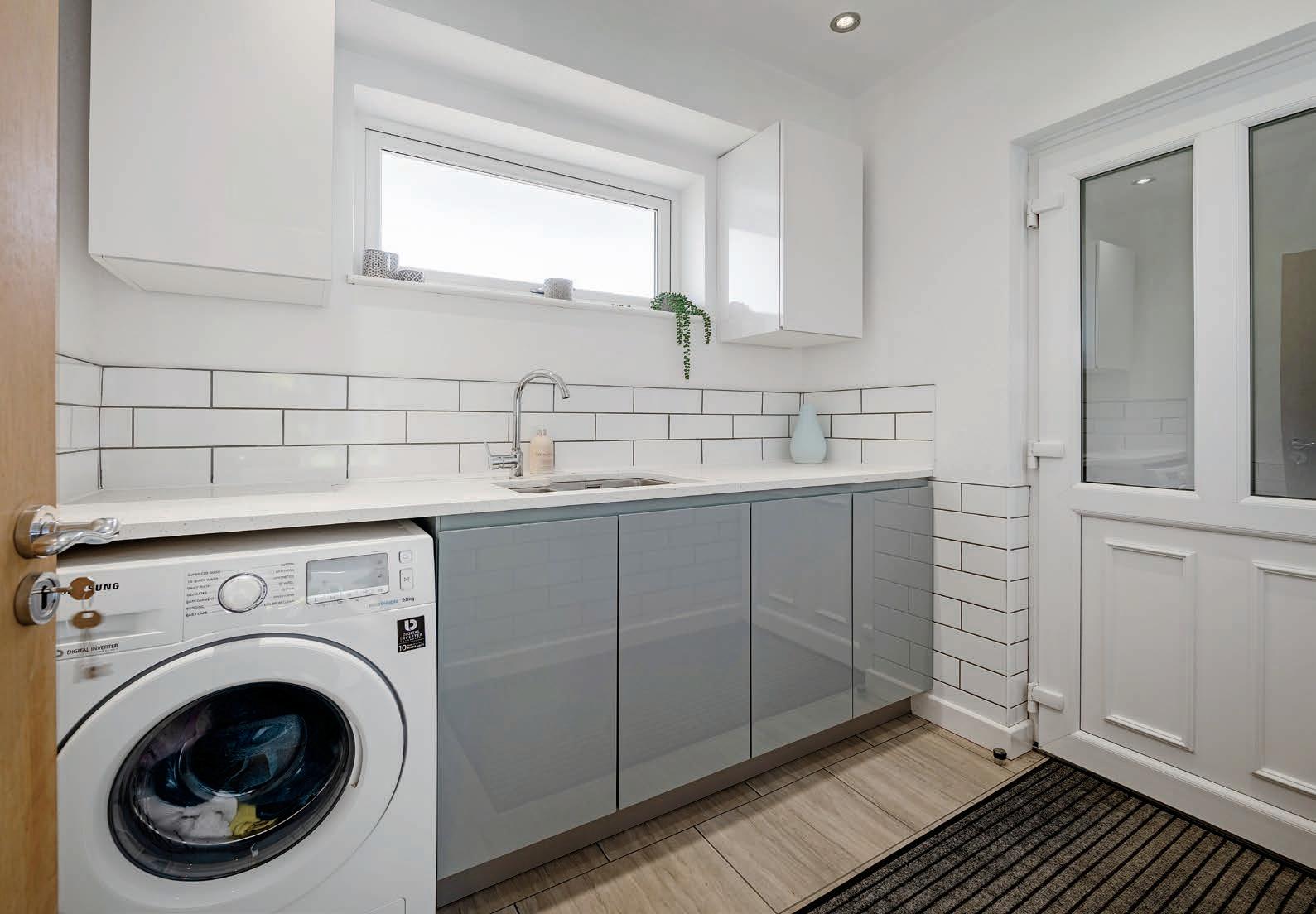 Welcoming you inside is a spacious hallway adorned with oak doors leading to the open-plan kitchen family room. Double glass doors seamlessly connect the family room to the sitting room and dining room, both enhanced by gas fires set into granite hearths complemented by oak fire surrounds. The kitchen is a culinary delight, featuring Silestone work surfaces, Amtico flooring, and high-gloss units including a large island with a range of pan drawers and ambient temperature wine fridges. Top-ofthe-line appliances include a built-in AEG fridge freezer, Miele electric oven, plate warmer, microwave, and induction hob. A Neff dishwasher streamlines kitchen chores. Adjacent to the kitchen, a utility room offers ample storage and leads to a rear lobby connecting to the garage, a second utility room/storage space, and a study, perfect for working from home, boasting oak flooring, power, and light, with direct access to the rear garden.