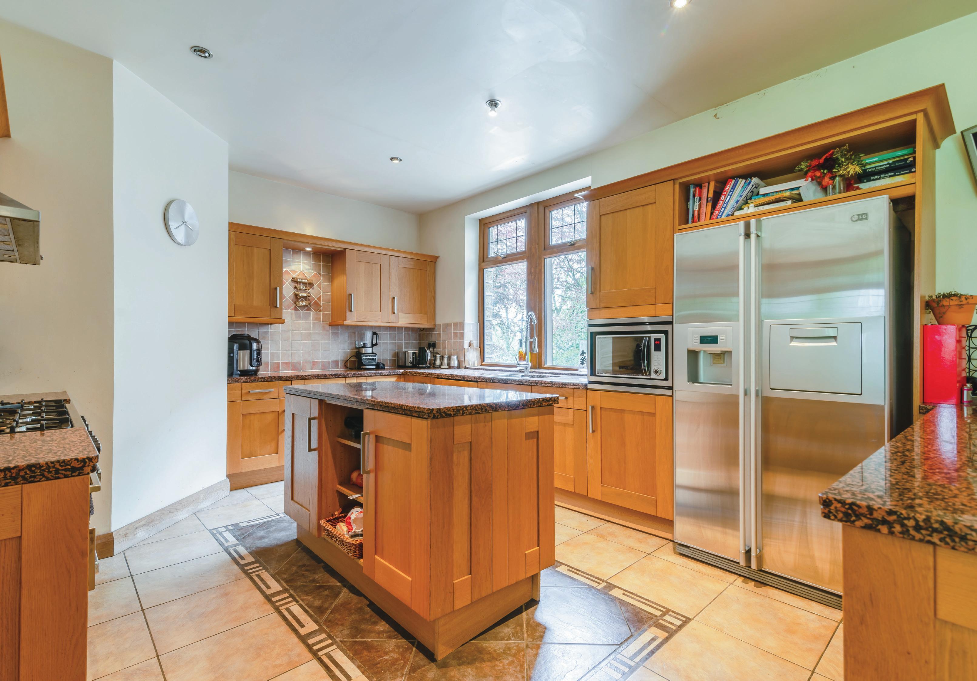 The living kitchen is presented in an L-shape format and incorporates the kitchen area and a dining area, has windows to two aspects, enjoys a high ceiling height, full tiling to the floor and a cast Iron fireplace to the chimney breast with an inset living flame gas fire. Oak furniture is complimented by granite work surfaces which have an inset drainer and incorporates a stainless-steel sink unit. An island has a granite surface with cupboards beneath and a compliment of appliances includes a Belling stove comprising a double oven and grill, a seven-ring gas burner and an extractor hood over. There is a microwave, a dishwasher and space for an American style fridge freezer.