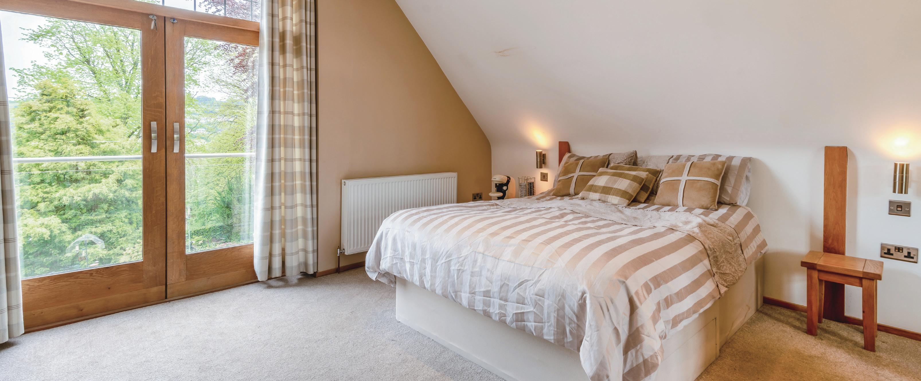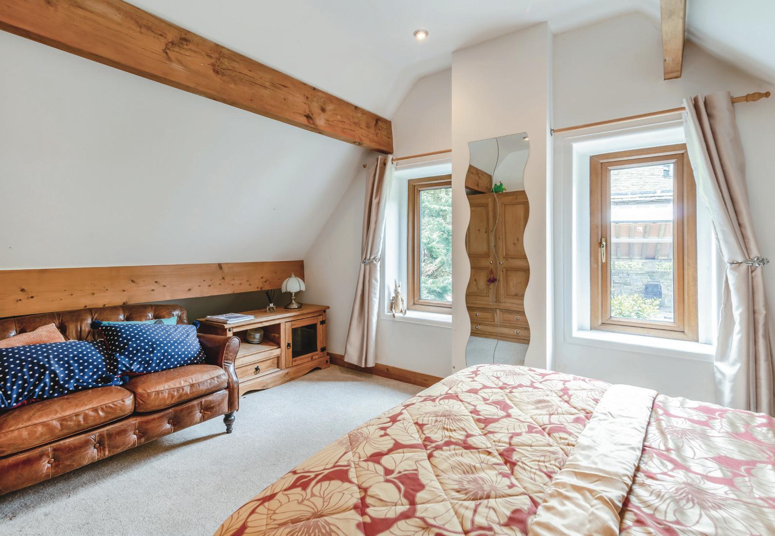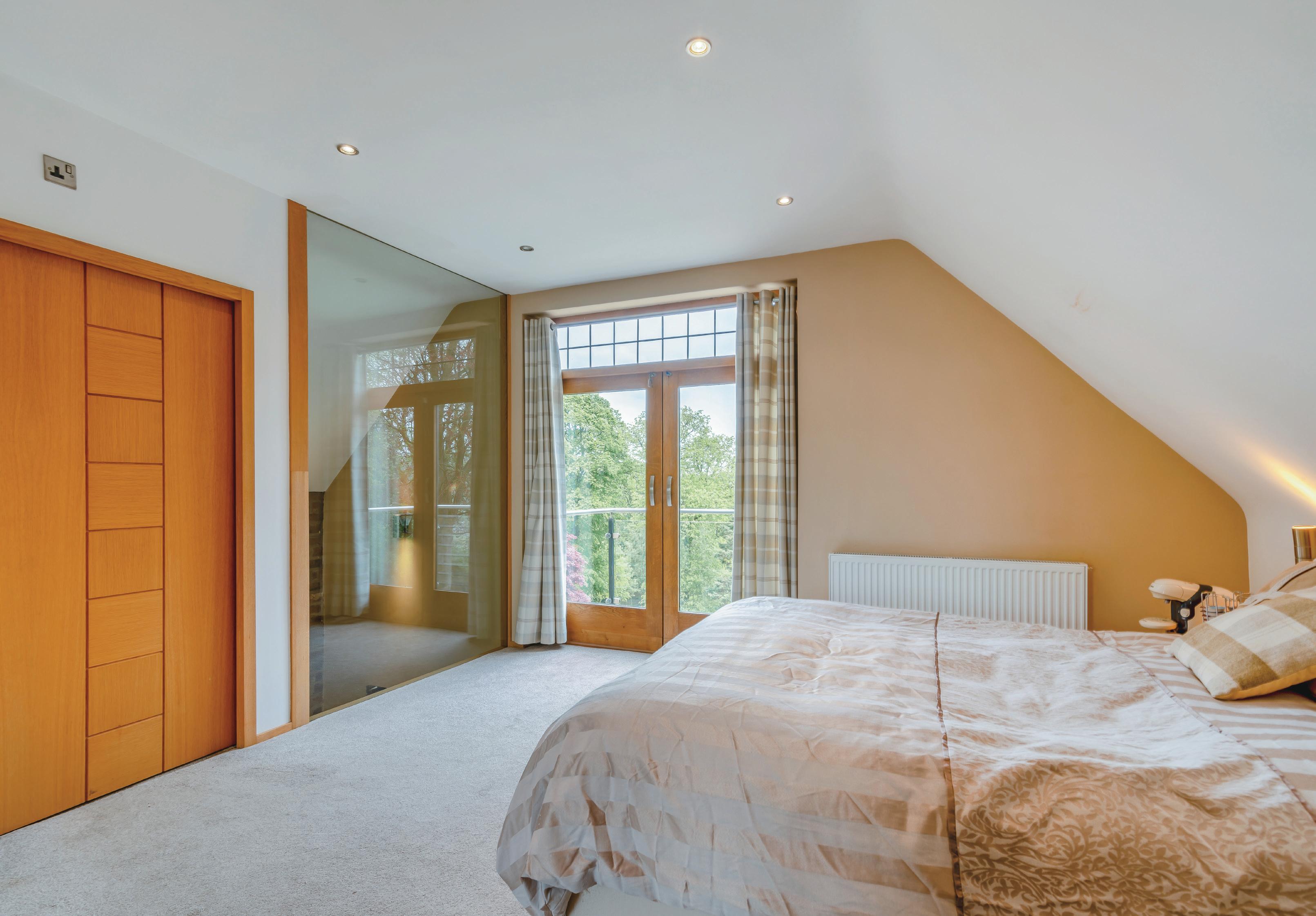 A bedroom to the front aspect offers double proportions, has exposed timbers into the apex of the ceiling and a glazed door opening directly onto a south facing balcony, commanding breathtaking cross valley views.