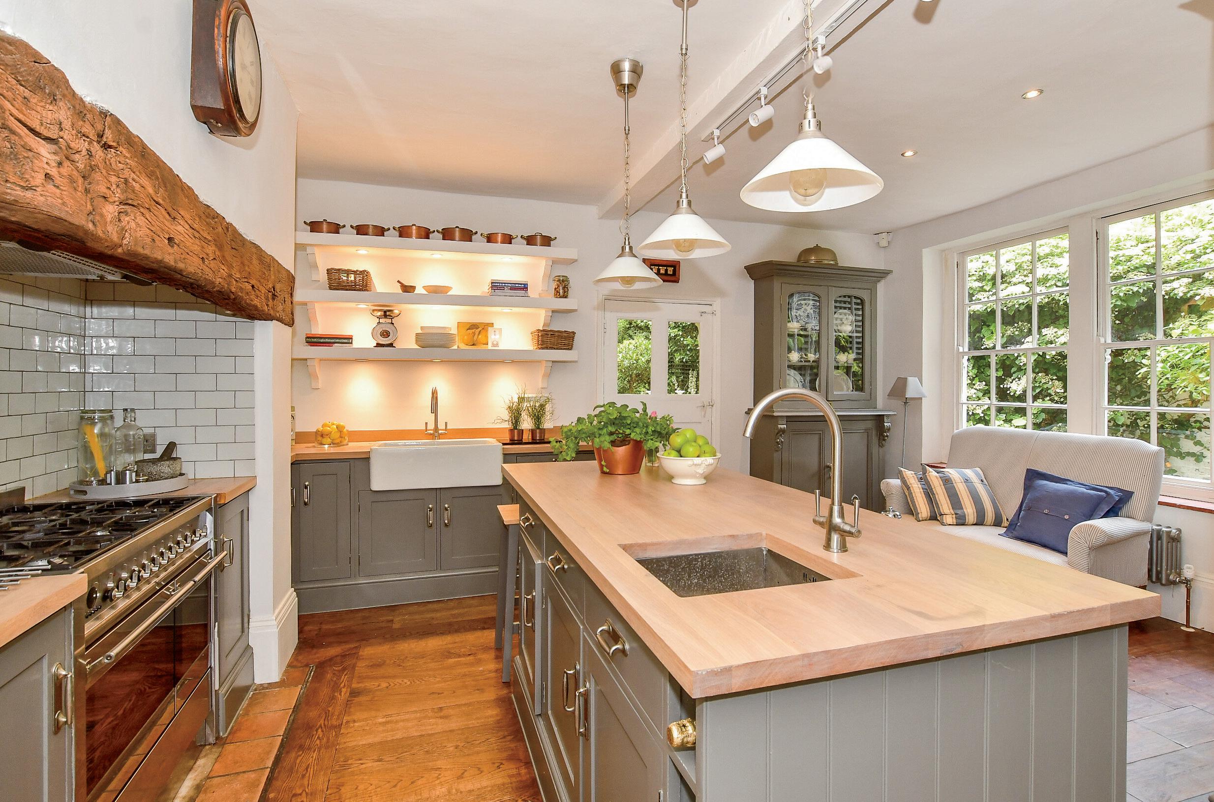 There is a downstairs cloakroom and the well equipped triple aspect, light and bright modern kitchen has everything needed for the most discerning of cooks. It includes a six ring range cooker inset into what was probably an original inglenook fireplace with Bressummer beam above believed to have come from an old Tudor ship. There are also a selection of grey painted shaker style units housing two larder fridges, a dishwasher and a centre island breakfast bar as well as a seating area and a wide door to the courtyard garden. Off the kitchen is a south facing panelled dining room with an attractive fireplace and large sash windows flooding the room with light. There is a large opening between the kitchen and the dining room housing concealed pocket doors. These enable the two rooms to become separated if required. Steps lead down to a vast basement that currently has a laundry area and wine store but it has the potential to become an office suite or a games/playroom and bar.