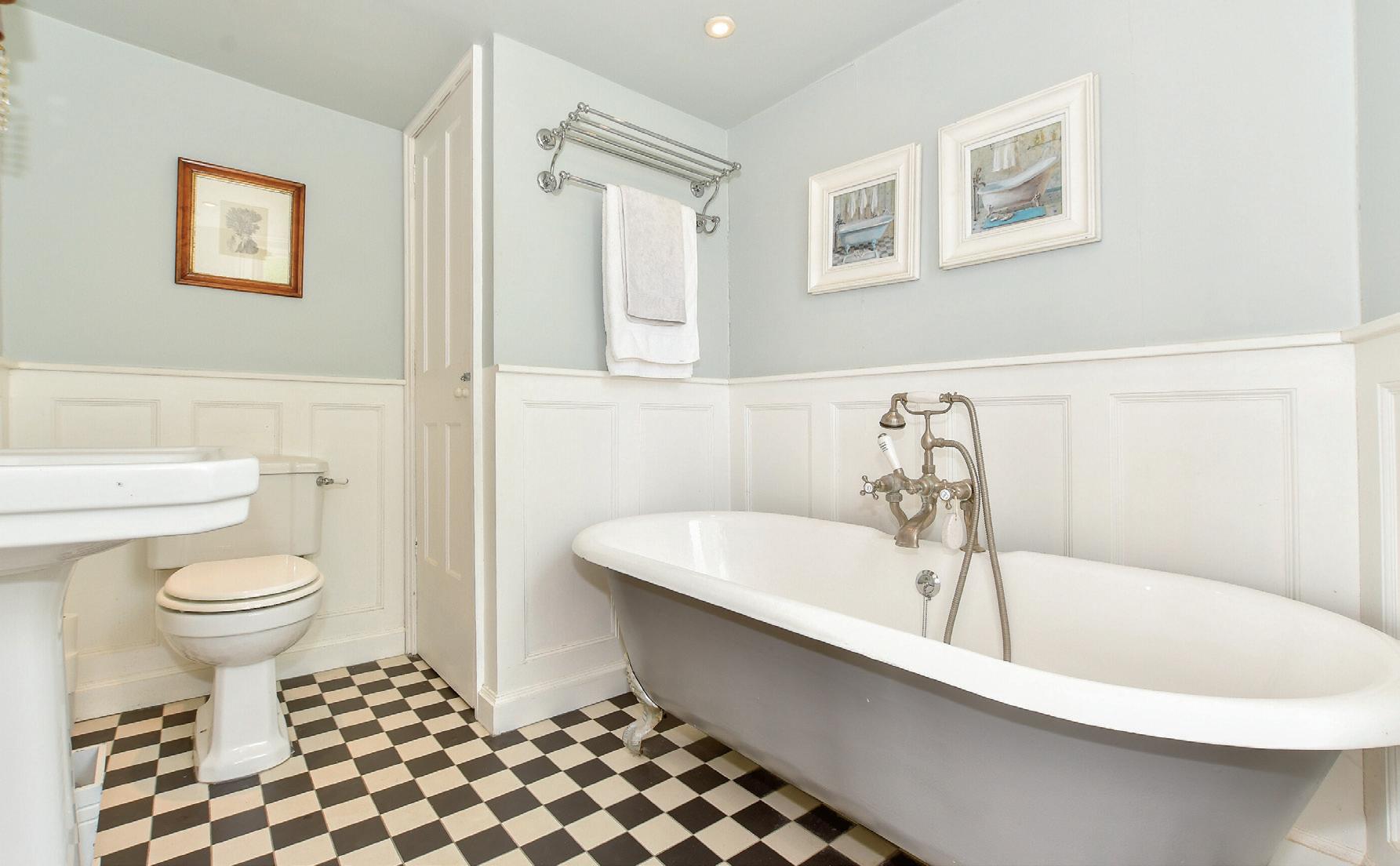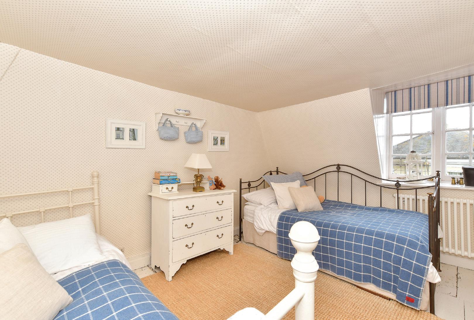 Stairs lead up to the half landing and branches off to the right where you will find a family shower room and an impressive dual aspect sitting room/library with restored 1950s Colefax and Fowler wall paper. There is an attractive fireplace with a gas log fire which makes a focal point. The main landing has a seating area and original wood flooring that continues into two spacious double bedrooms. Both these rooms have seaviews. One bedroom has an original fireplace whilst the other has an en suite bathroom incorporating a stand alone claw foot bath. On the second floor there is an atrium style landing with storage cupboards leading to a family bathroom and three double bedrooms, all with sea views. The largest of these bedrooms has a vaulted ceiling, painted floor boards and half panelled walls. This entire floor could be a self contained area or a great place for youngsters to have their own space.