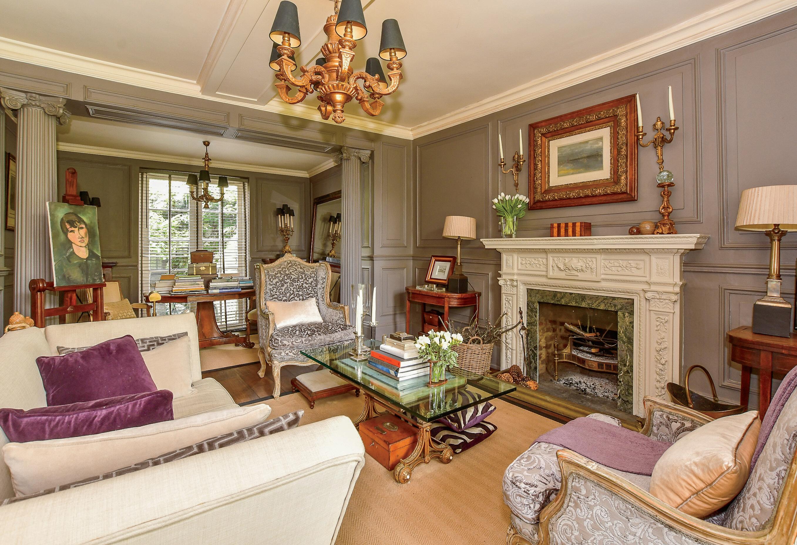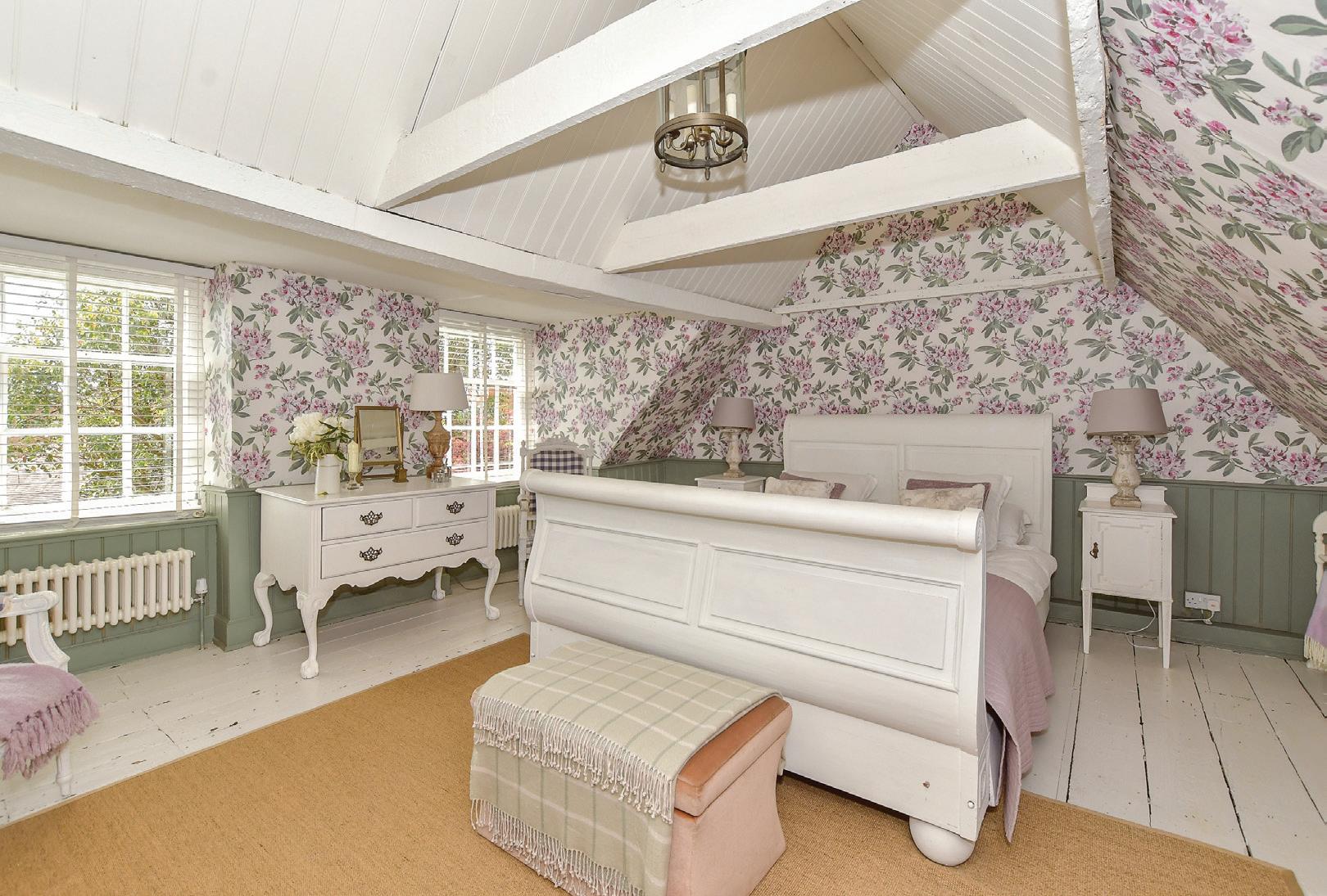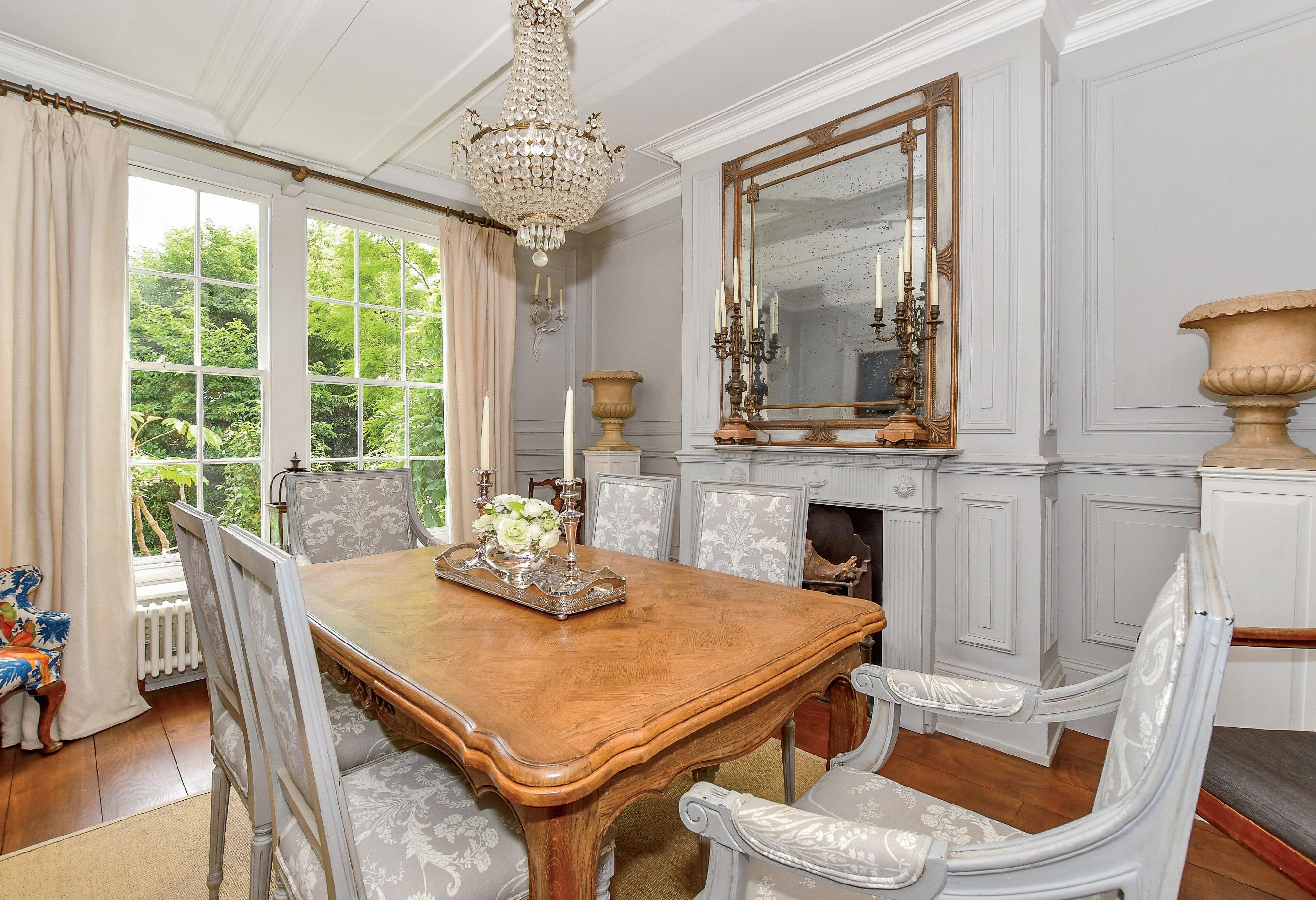 Adjacent to the street are two garages and two parking spaces and a pedestrian entrance gate in the wall. This opens onto steps that lead up to the attractive and secluded front garden and vast front terrace with steps up to the wisteria covered front door. With its exterior ‘dolls house’ symmetry, multi-pane sash windows, Kent peg tiled roof and high chimneys at either end it has delightful external appeal and this appeal continues as you cross the threshold. The elegant and spacious dual aspect drawing room has French doors to a secluded courtyard and an ornate and sculptured mantle and fire surround fireplace with an open fire. There is also a very wide arch flanked by a pair of pillars to a charming reading area.