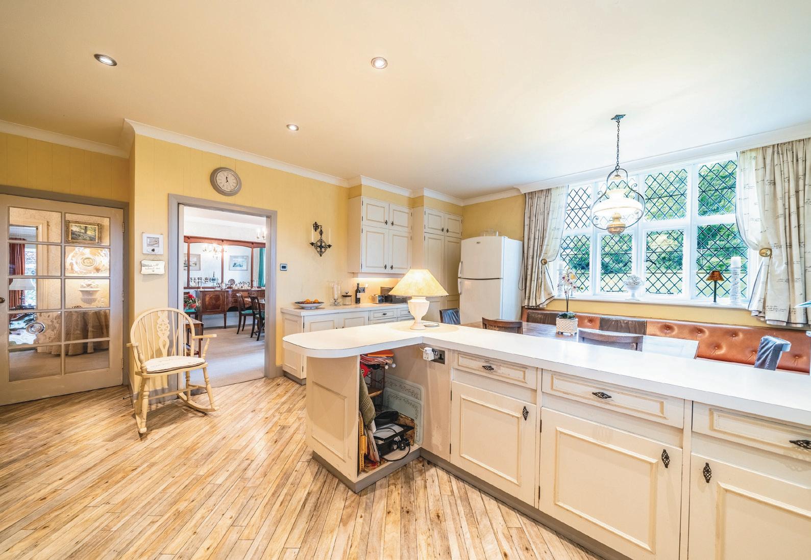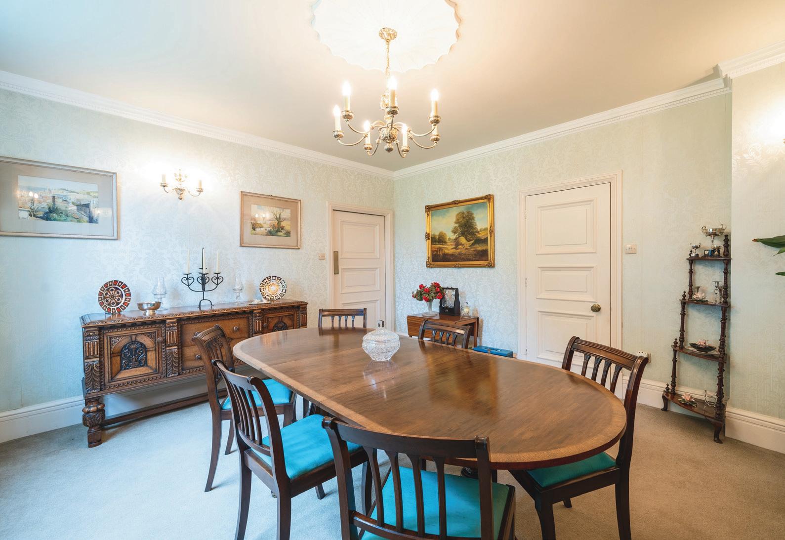 Continuing your journey, you are greeted by the grandeur of the living room through its expansive double doorways. Original features grace this inviting space, like the imposing fireplace. Moreover, the expansive window seating offers a captivating focal point, commanding attention and providing an ideal vantage point to appreciate the impressive gardens.