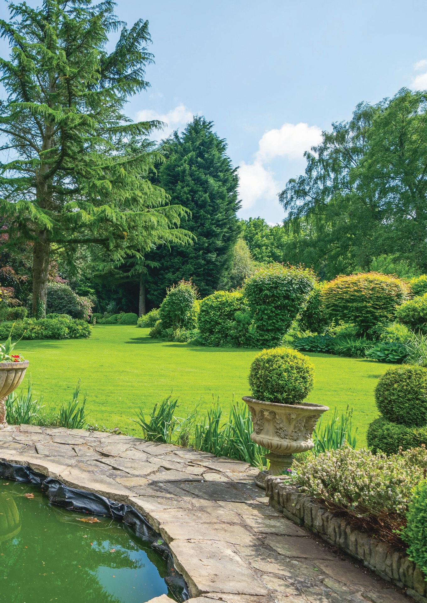 Begin your journey on the picturesque patio, boasting elegant seating areas overlooking a tranquil pond. Step into the sprawling lawns that offer space for leisure and recreation, while a hidden woodland, adorned with vibrant bluebells, evokes enchantment.