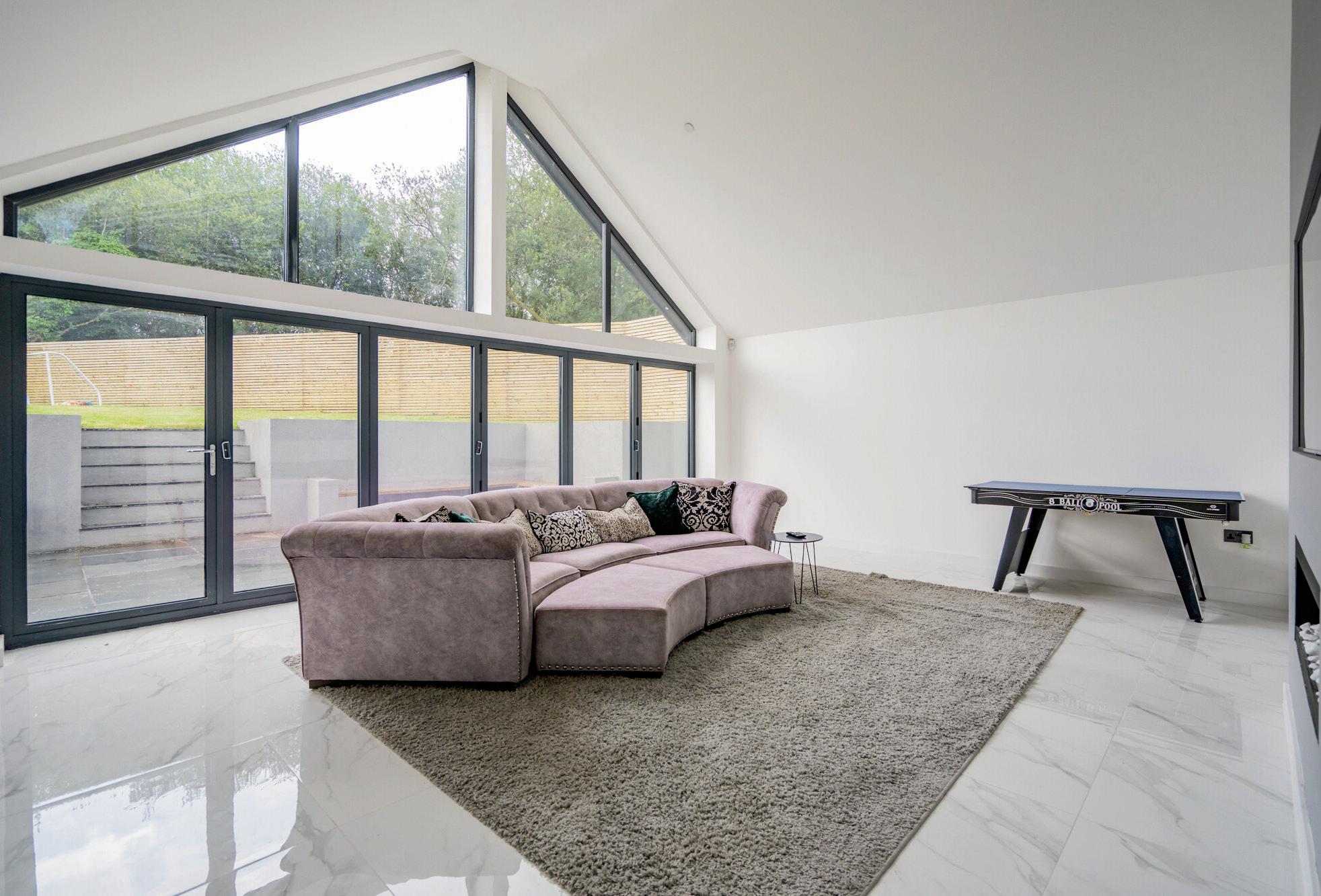 The open-plan kitchen/breakfast/family room is a stunning space that effortlessly combines functionality and style. The area is beautifully bright, thanks to the feature window at the rear, complemented by bi-folding doors and an additional large window that floods the room with natural light. The entire space boasts tiled flooring and spotlighting, creating a contemporary and welcoming atmosphere.