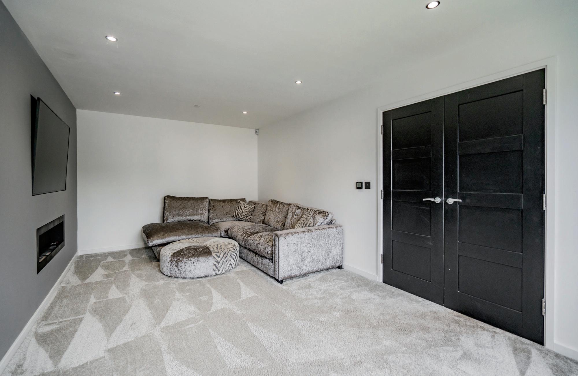 Accessed via double doors, the lounge is a bright and inviting space with abundance of natural light flooding in through the window at the front. This room offers carpeted flooring, two alcoves with spotlighting, and ample space for an inset 65” TV, allowing you to enjoy your favourite entertainment in style. Additionally, there is dedicated space for a feature fireplace, providing a focal point to the room.