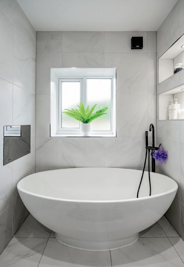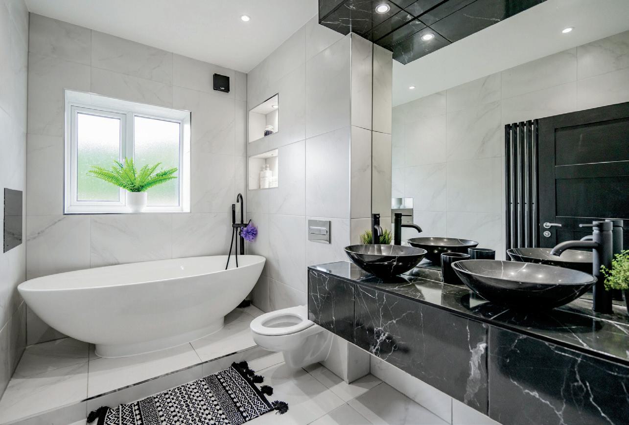 The modern family bathroom has the pleasure of housing a Roca WC, twin wash basin, mirror with sensor lighting, feature bath with free-standing feature tap & hand-held shower head, waterproof wall mounted mirror/TV, feature radiator, two inset shelving, extractor fan, spotlighting, and is fully tiled.