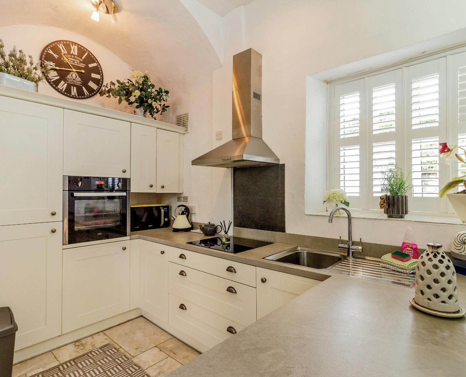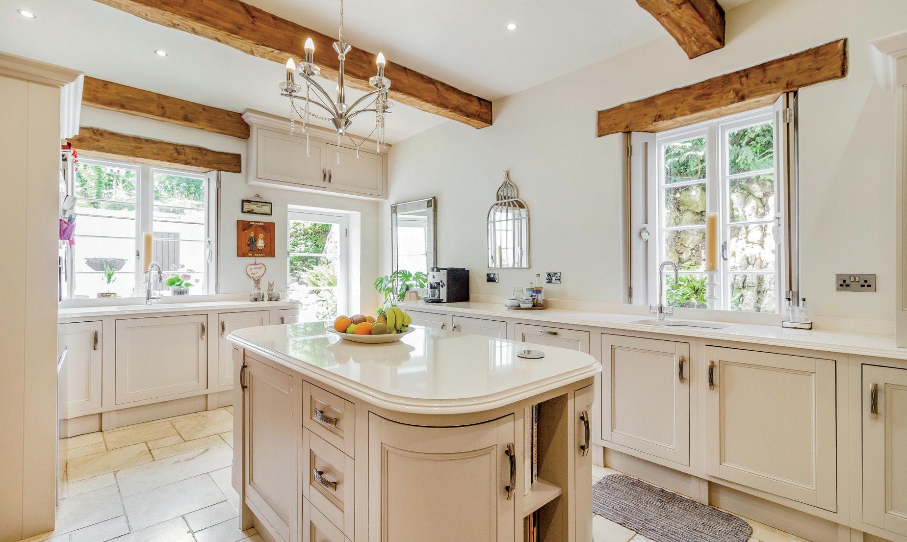 There are granite worksurfaces, a porcelain twin sink, hot water tap, built-in appliances, a Rangemaster induction hob and extractor hood, plus double oven and warming trays, all cloaked in tasteful neutral decor and crowned with an original oak beam which was reclaimed from one of the ceiling beams.