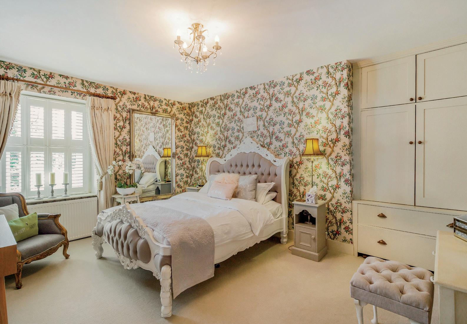 If the east wing is used as part of the main house, the upstairs boasts six charming bedrooms that include vintage wallpaper believed to date back 200 years, wall panelling and exposed stone walls, and five luxury bathrooms. The principal bedroom is a stunning suite offering a dressing room with built-in wardrobes as well as a sizable ensuite shower room.