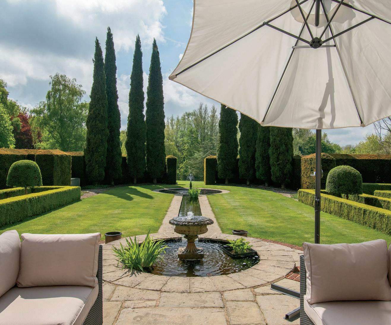 The formal garden has high hedge privacy fencing around the perimeter and has a terrace looking over the spectacularly professionally designed garden with two water features and low boxed hedging and is reminiscent of a stately home.