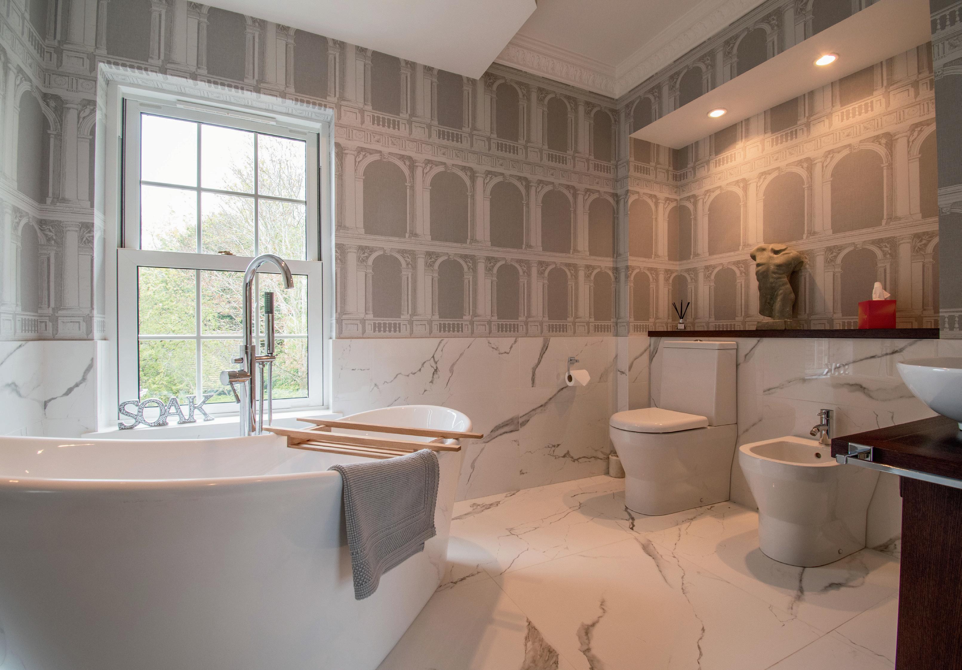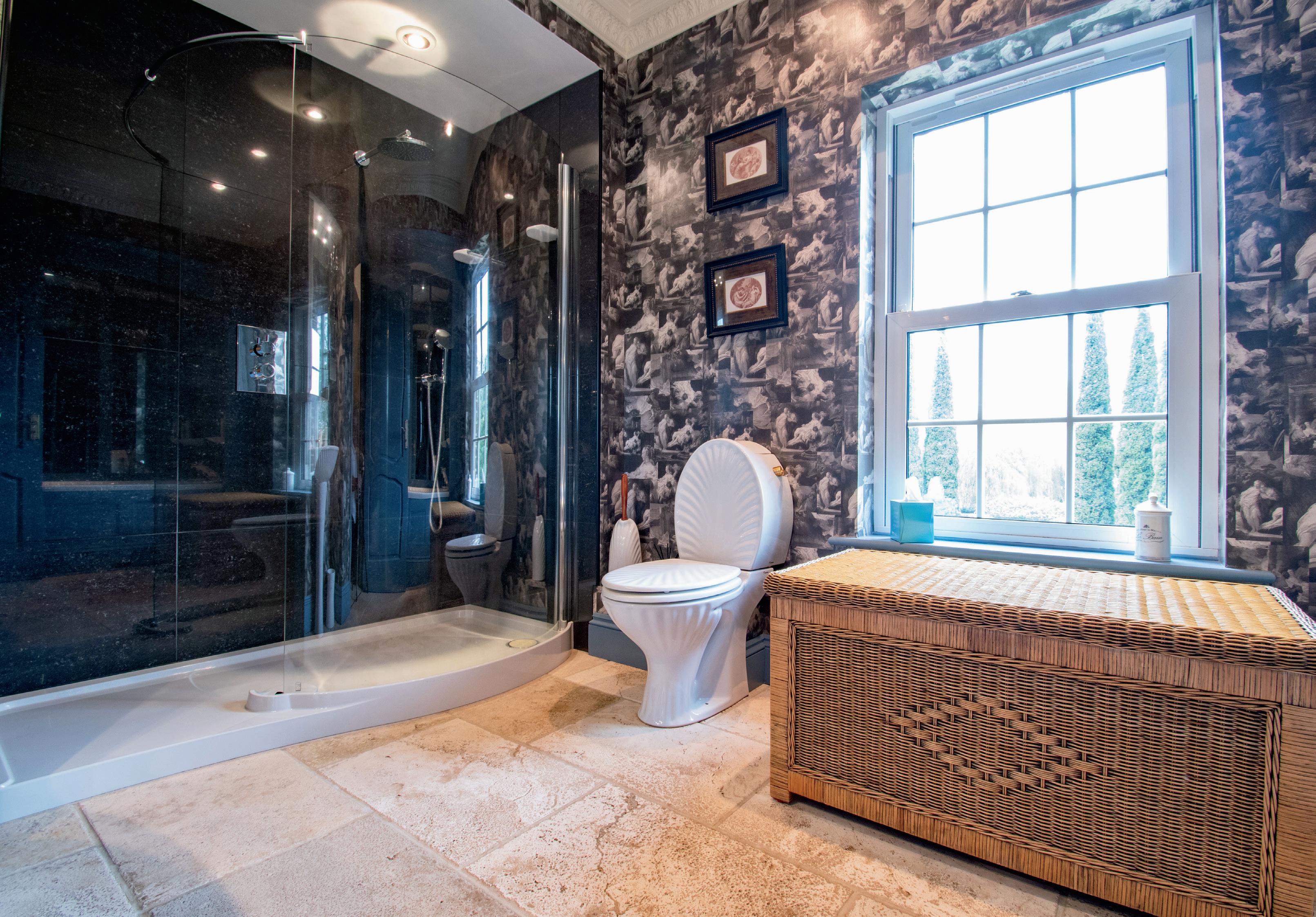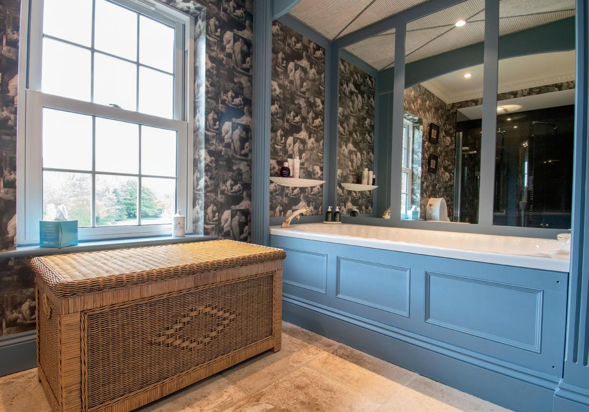 To the opposite side of the sunroom is the formal dining room, decorated with bespoke fabric wallpaper, providing a sophisticated space for hosting dinner parties.
