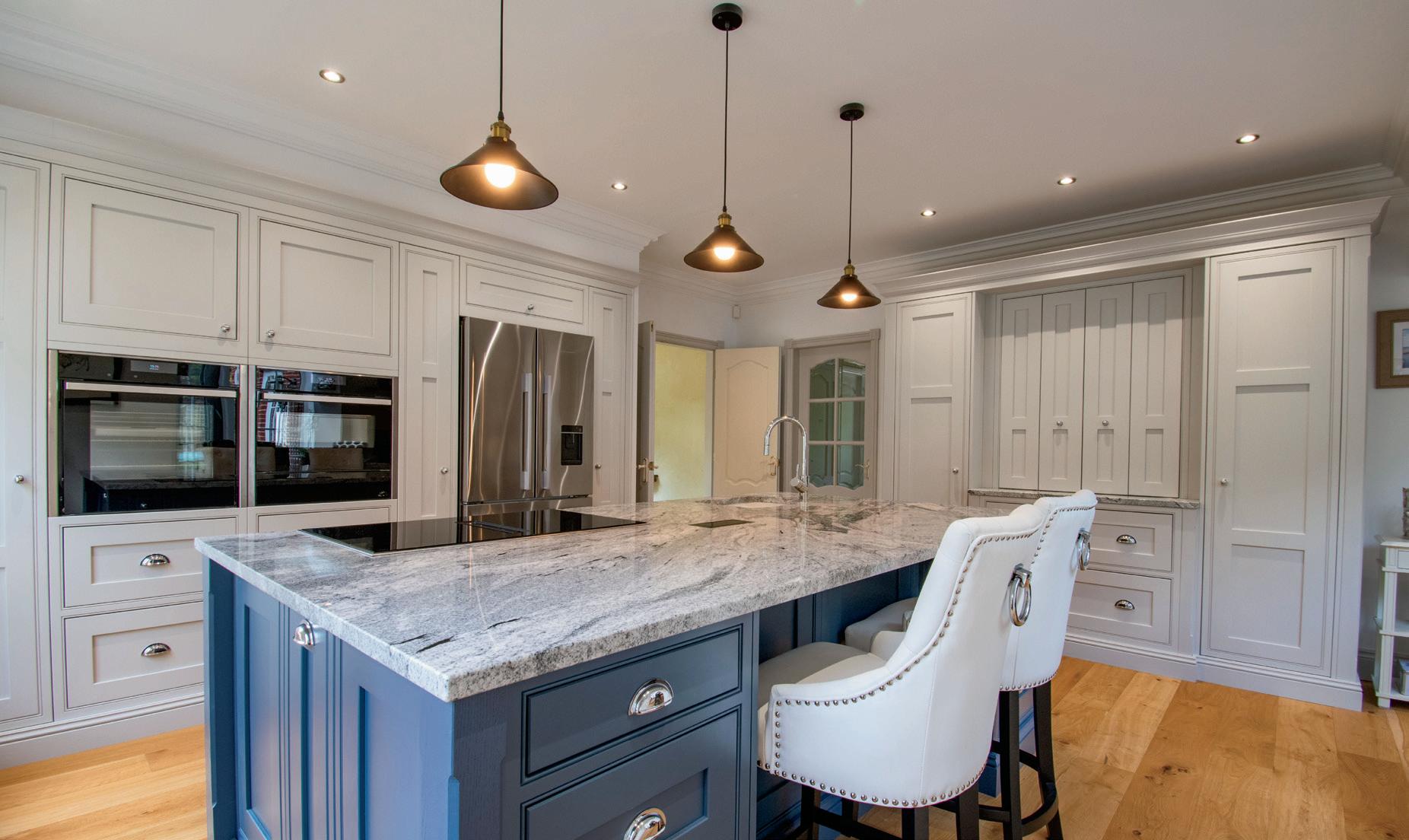 Kitchen appliances to the center Island - slimline wine cooler, dishwasher, Paykel fridge freezer, induction hob with integrated extractor fan, pop up socket panel. Neff Microwave combination oven with a warming draw beneath. Neff multi-function oven with a steam facility. Insinkerator instant hot water tap