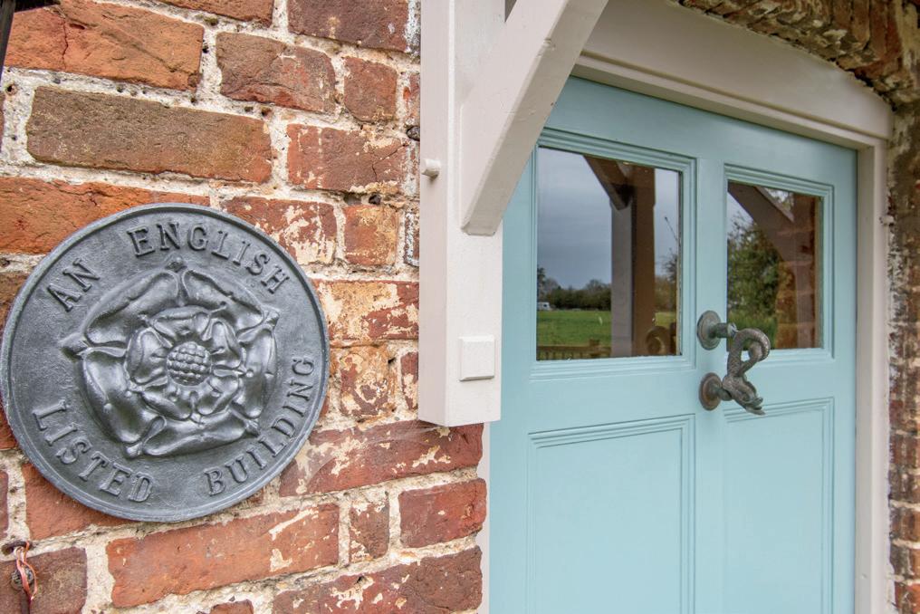 A path leads to the side aspect of the property where the centrally located canopied entrance door, has a wall mounted English heritage plaque. This was the original formal entrance to the farmhouse and now looks onto a lawned garden with mature flower beds. A paved lavender path across the lawn leads to a raised original well with a hand pump which is still in working order, fitted with a safety grid. A large gate opens into the rear garden and there is an opening to the directed public footpath (see note).