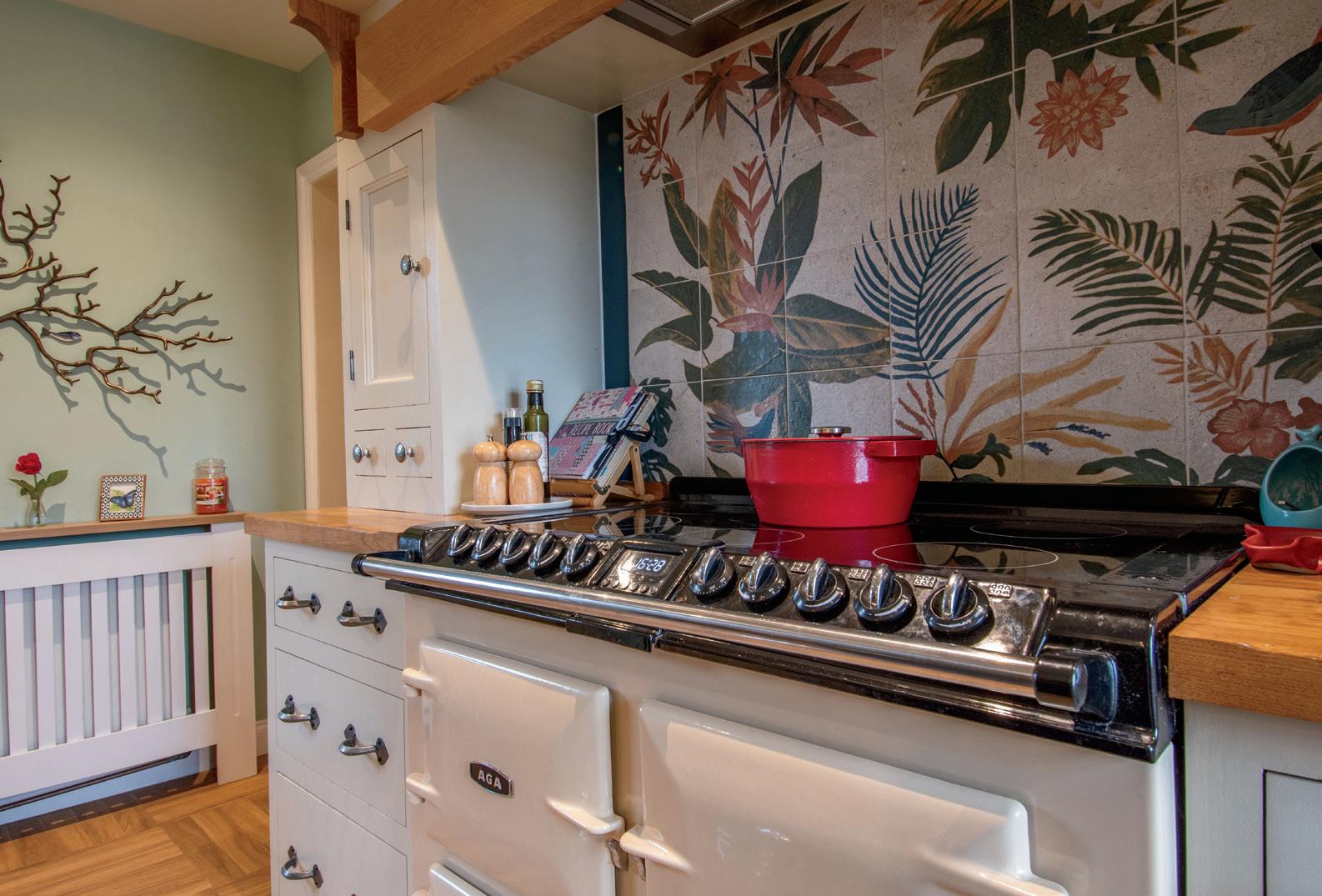 Kitchen appliances include an electric Aga Stove with six ring ceramic hob, extractor fan over and an integrated dishwasher.