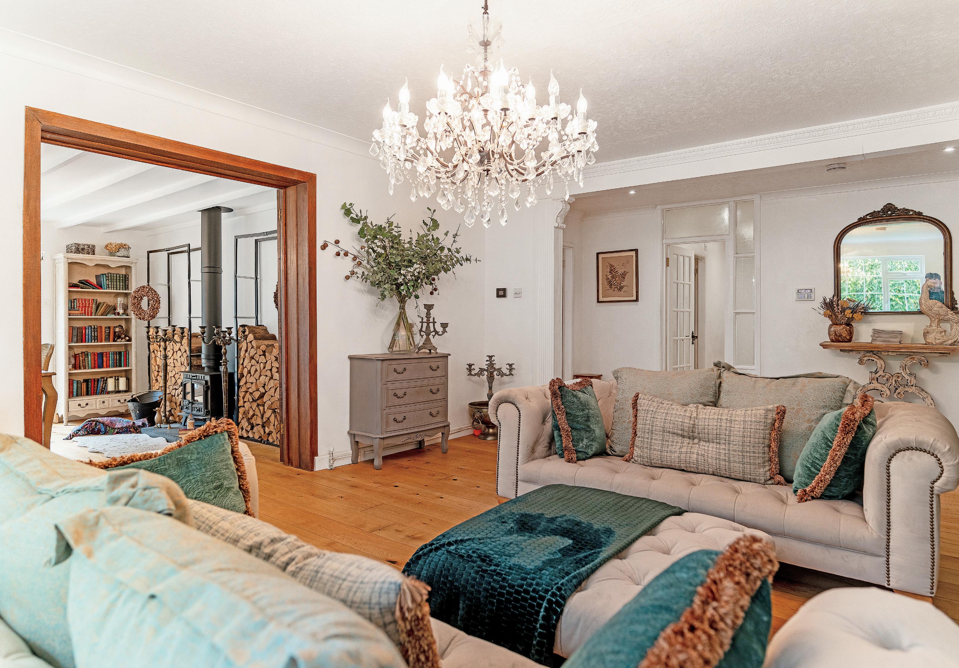 The property has an arched entrance door that leads to a generous porch with a further door that leads into a large open plan hall and sitting room with open fireplace and a double-glazed window overlooking the side gardens. Double doors lead off to an attractive dining room with French doors leading to the rear terrace and a log burner. Adjacent to the dining room is kitchen/breakfast room fitted with a range of white units and an island unit with timber work surface, together with a built-in wine chiller, microwave and a quality Rangemaster oven with induction hob and extractor hood. Just off the kitchen is a useful utility room and pantry area