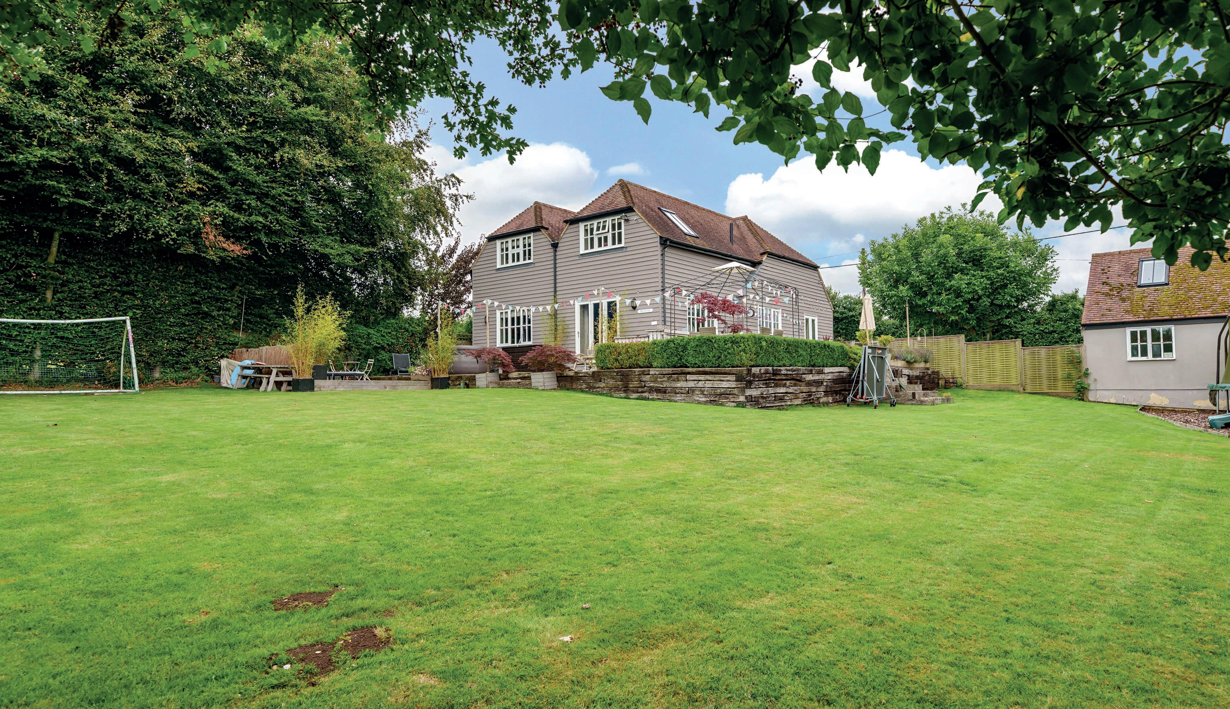 Driving down a leafy lane on the outskirts of Kingston village you come upon Lyndale, surrounded by the most stunning countryside. There are superb views in every direction across the rolling hills of the Elham Valley and it is no surprise that it is in an Area of Outstanding Natural Beauty. This veritable Tardis of a property has been transformed in recent years to become a superb modern family home with the opportunity to create additional, detached accommodation. It is set well back from the lane and approached through a five bar gate onto a very spacious block paved driveway bordered by a front lawn and where you can park a number of vehicles. With its charming pillared and covered porch, traditional Kent weatherboard exterior, multi-pane bay windows and cathedral style dormer windows the property has real kerb appeal even before you walk through the front door.