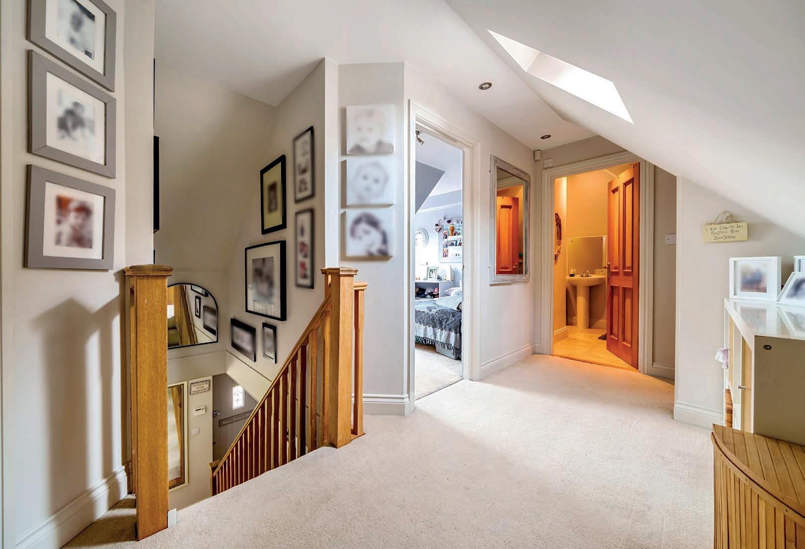 There is a delightful hall that opens to the charming snug/study and has stairs to the first floor, understairs storage and a wall of fitted cupboards as well as a desk that is built into the bay window, so you can enjoy the rural views while you are working. A door leads to the superb open plan, dual aspect kitchen/diner with its engineered oak flooring that flows through to the sitting room, a bay window with French doors to the terrace, a Rangemaster cooker and shaker style units housing various appliances. There is also a large island breakfast bar, plenty of space for a table and chairs and access to the adjacent utility room with laundry facilities and the adjoining cloakroom. A very wide arch leads to the dual aspect, light and bright lounge from the kitchen/ dining room, continuing the open plan feel. It includes three bi-fold doors to the wraparound paved and decked terraces with views across the nearby vineyard and, when these doors are open, you really are bringing the outdoors inside but on a cold winter’s evening you can sit in front of the charming brick fireplace with its large log burner.