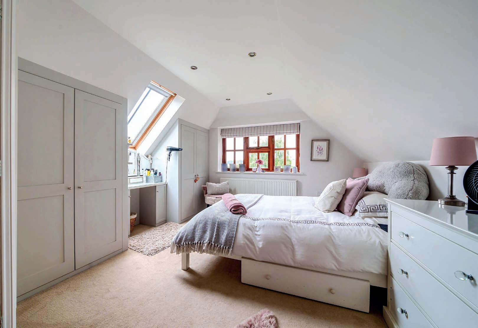 Upstairs there is a family bathroom and four bedrooms with partially vaulted ceilings, eaves storage and superb views across the Elham valley as far as the eye can see. There is the first bedroom with an en suite shower as well as built in wardrobes and a dressing table, a guest double with an en suite cloakroom, another with a built in desk/dressing table and the fourth includes built in cupboards.