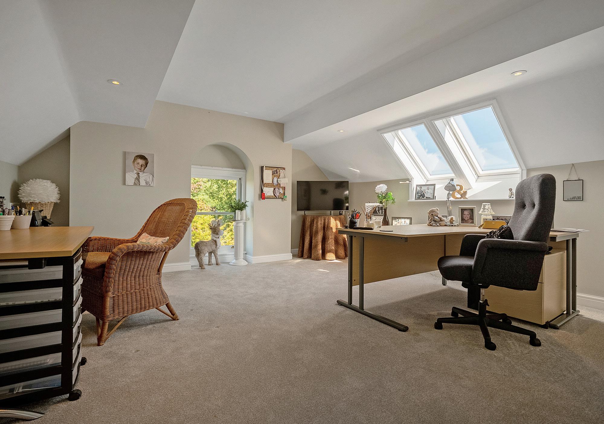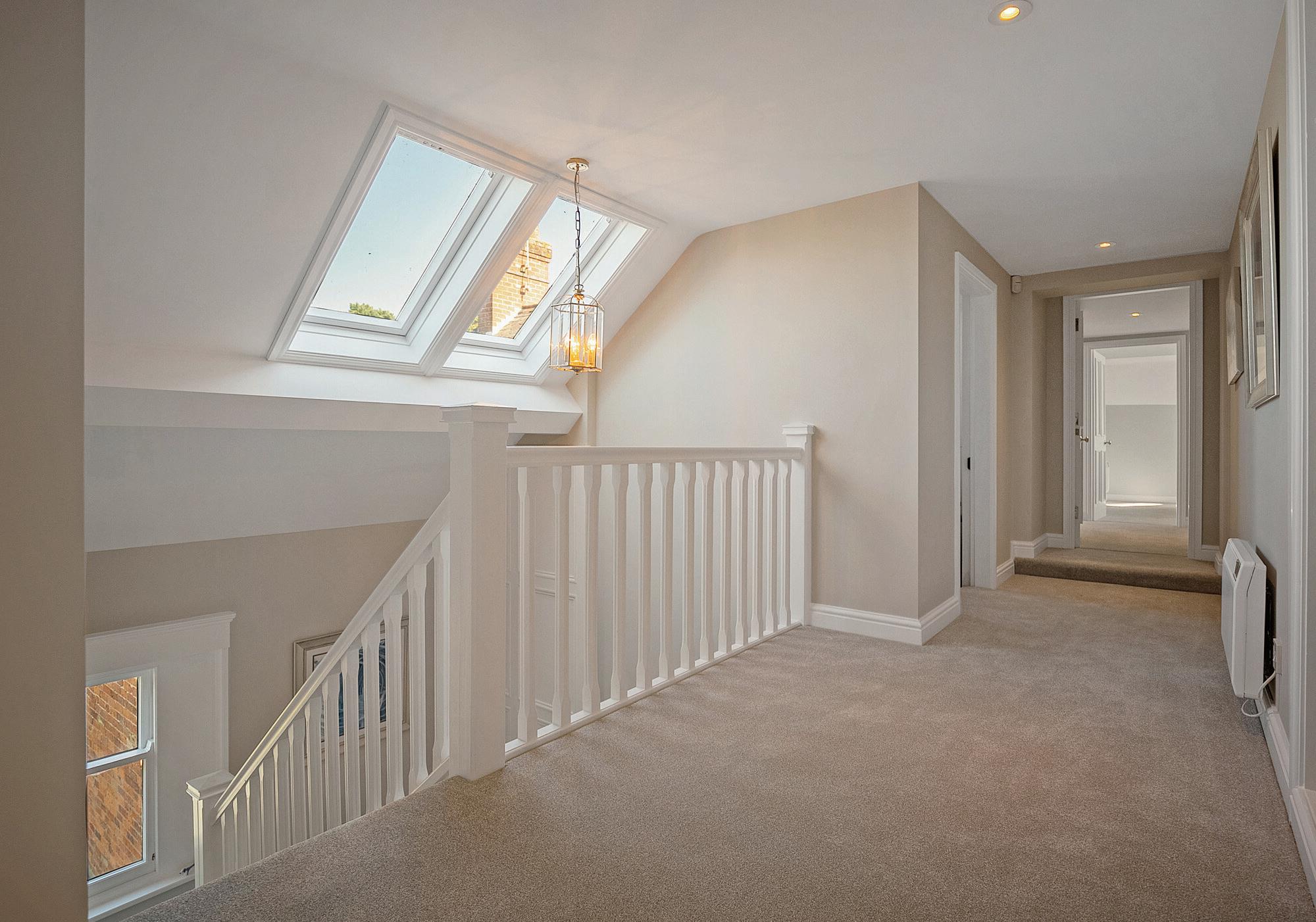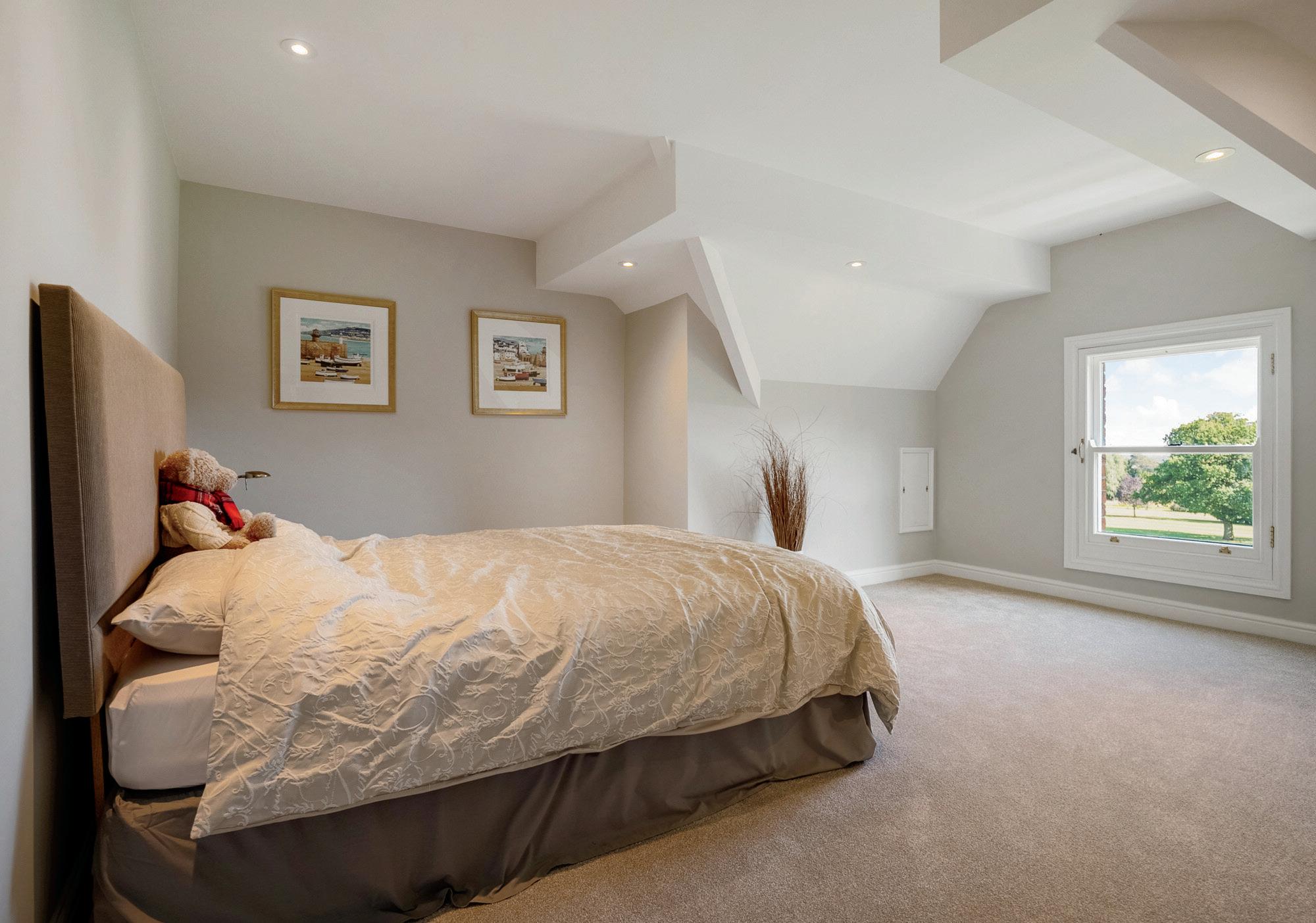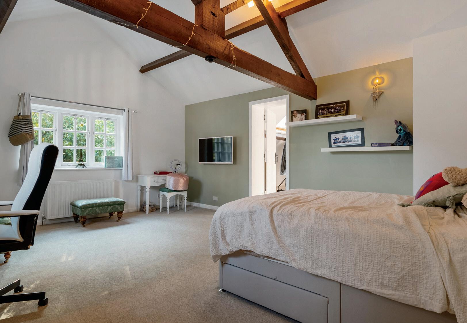 The decorative oak feature staircase gracefully floats up to the first-floor galleried landing with wide corridors and high ceilings. On this floor you have the luxurious and spacious primary bedroom suite which features large double glazed sash windows overlooking the field and nearby church, a walk-in wardrobe with fitted units and centre island, and access to a stunning ensuite with separate walk-in shower, a recessed bath, heated towel rail and Vitra sanitaryware.