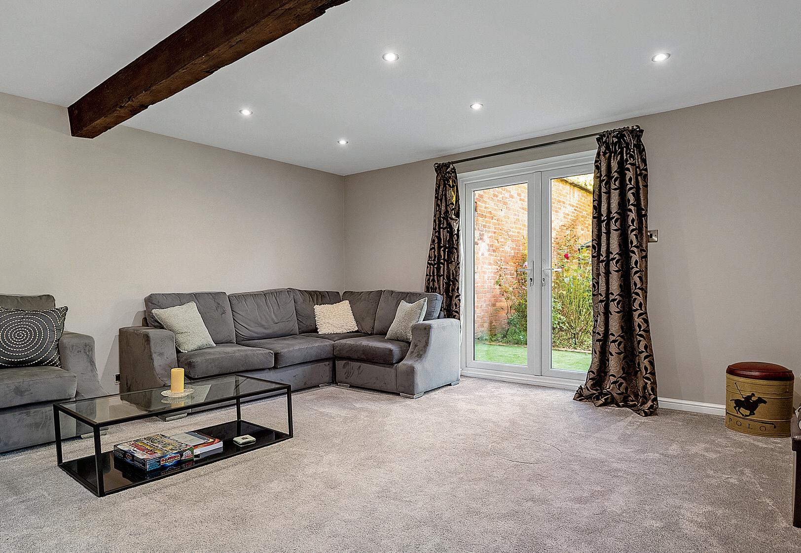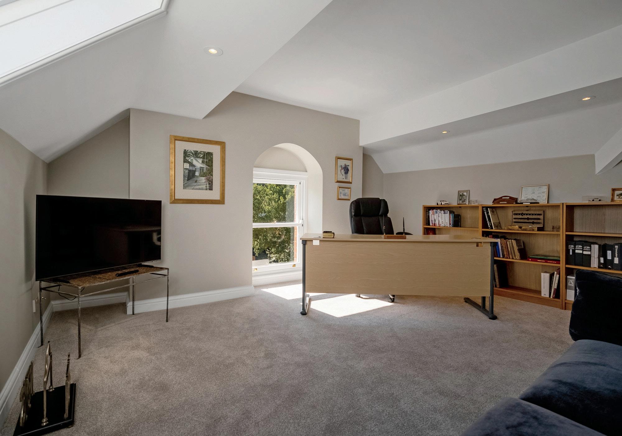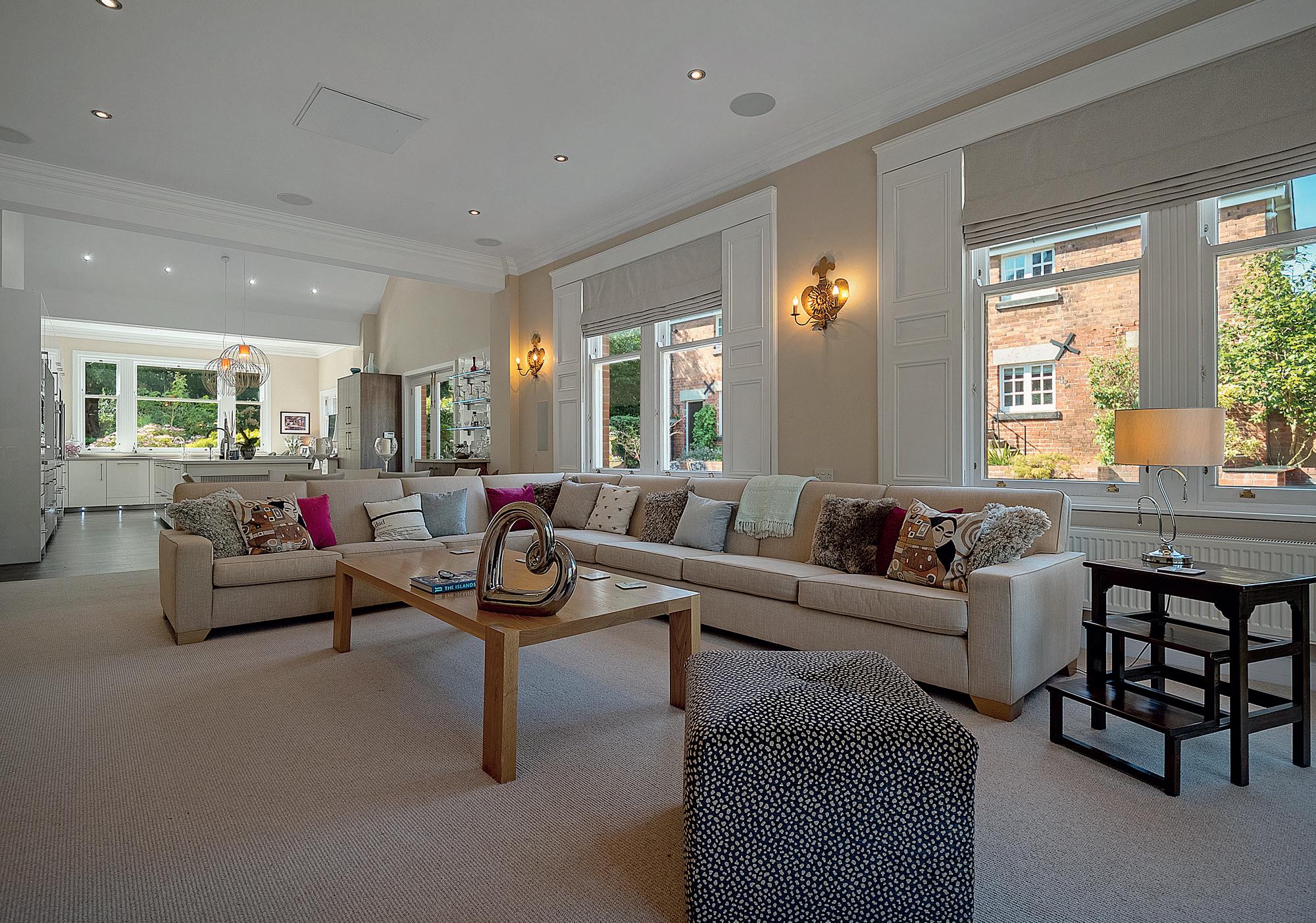 The kitchen has Karndean flooring, high ceilings with recessed spotlights and double-glazed large sash windows which flood the space with natural light making it beautifully bright and airy. The kitchen also provides access to the private courtyard that links the main house to the coach house. Accessed off the kitchen is the fantastic family room with lots of sash windows, high ceilings with built in cinema projector, ceiling speakers and patio doors leading out onto the rear patio area. The windows throughout the property have all been sympathetically replaced by the current owners, to remain in keeping with the style of the property.