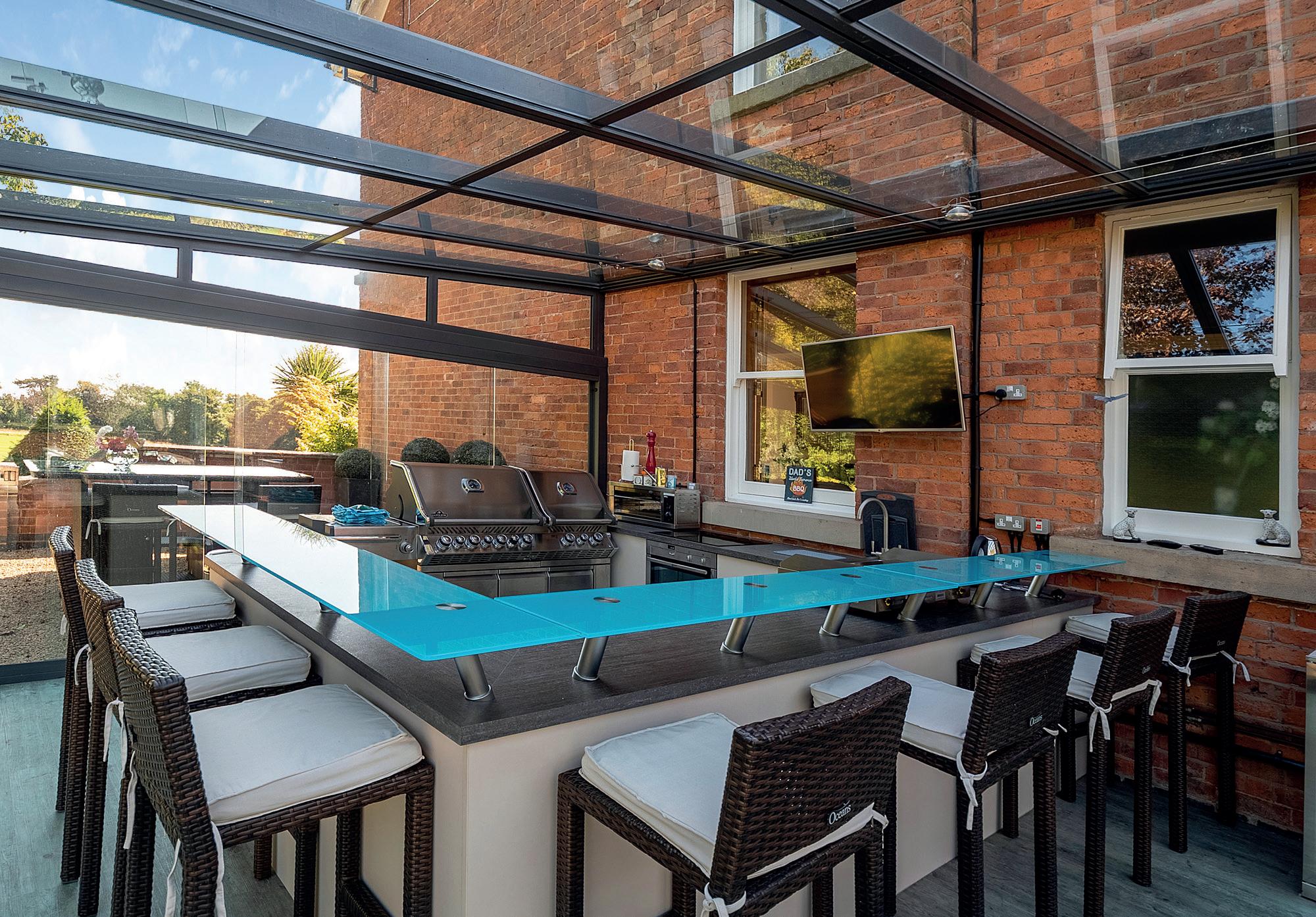 The hallway located off the kitchen leads to a very large utility room with Karndean tiled floors, a butler sink, plenty of storage cupboards, a feature brick surround with stone lintel and the mainframe control panel for the house entertainment system. This includes the CCTV, CAT 6, Security and Alarm, Star Link internet system with high speeds around the property and outside. Opposite the utility room is a well-appointed w/c and the plant room which houses the two Viessman boilers and the central vac system. Positioned between the plant room and W/C is a door leading out to the stunning glass garden room that overlooks the manicured landscaped gardens and patio area. This contemporary living space with sliding glass doors and glass roof features an outdoor kitchen and bar area with sink, induction hob, double gas grill, oven and fridges. This room is ideal for entertaining or relaxing with its seating and dining area, hot tub and pool table. The garden room also provides access to another room that features a sauna, shower with hammam and w/c.