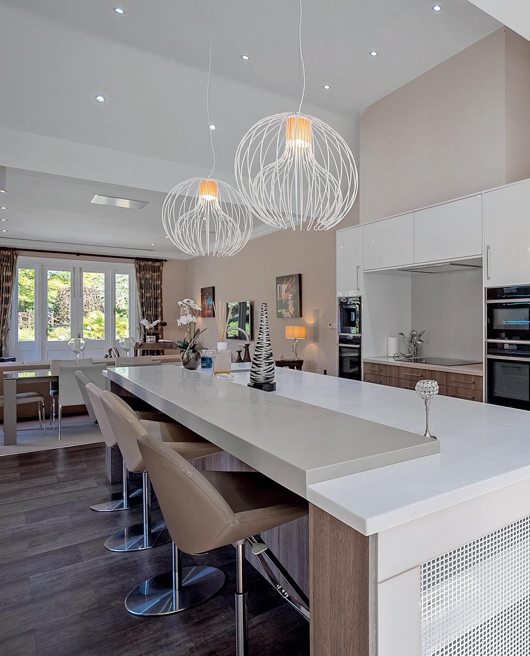 The heart of this magnificent home is the open plan kitchen, breakfast area and entertaining area. The handcrafted kitchen by Creative Interiors is a real feature of this stunning family home. The kitchen boasts a large centre island that benefits from Corian worktops, and an inset stainless steel prep sink. Located to the side of the kitchen are the main cupboard units boasting Neff appliances including two built in ovens, an induction hob, a microwave, two warming draws and a built-in coffee machine. There is also a large commercial grade Sub Zero fridge freezer with wine cooler which gives the kitchen a real contemporary feel. To the rear of the kitchen are two chrome sinks and a Quooker tap.