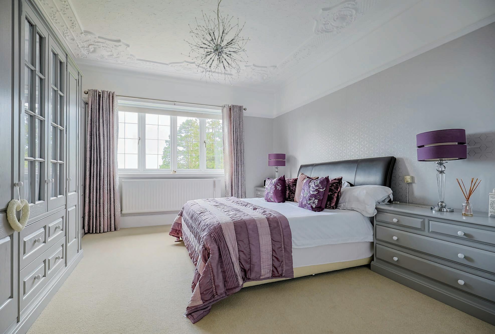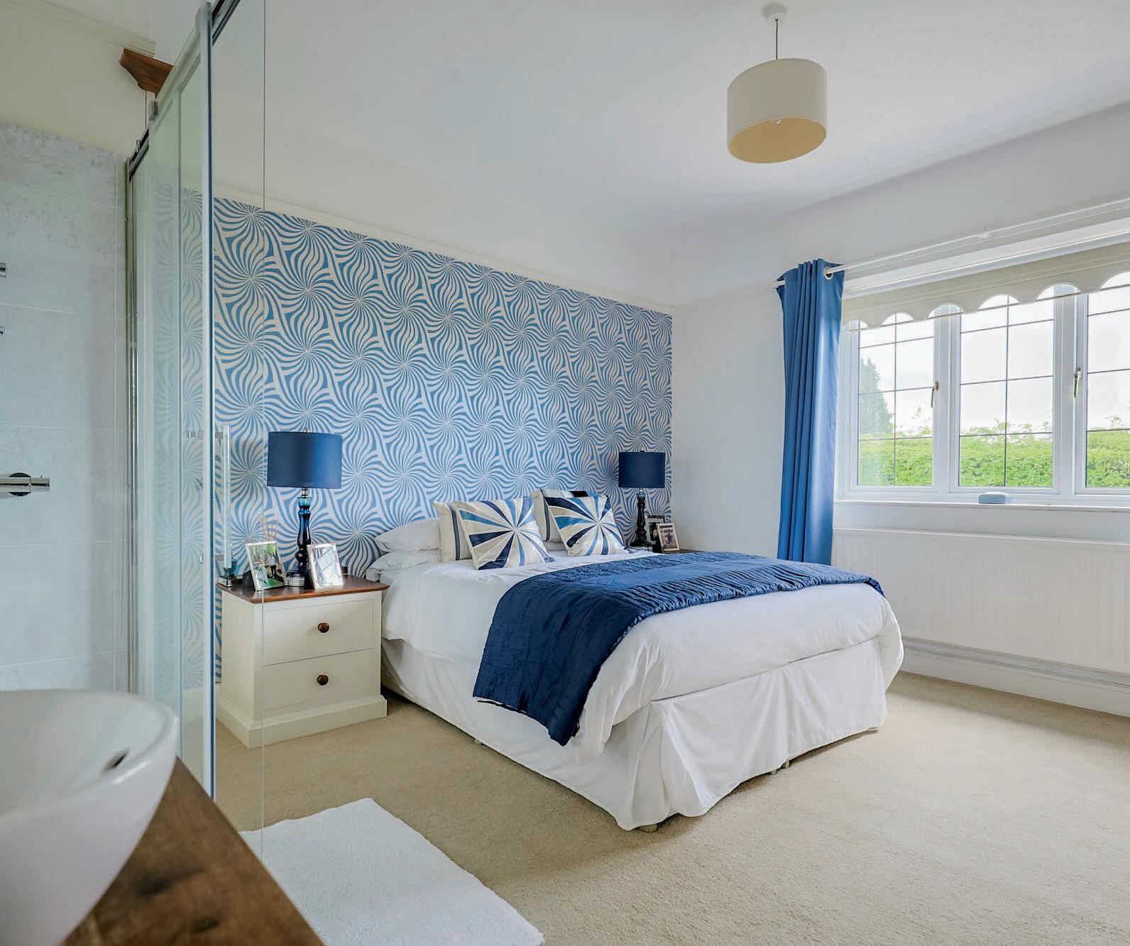Situated at the back of the home with a window to the side, bedroom four is a bright and airy double bedroom. This room features carpeting, high ceilings, a plate rail, a shower cubicle, a wash basin with a vanity unit underneath, part tiled walls and an array of fitted wardrobed with hanging rails and shelving.