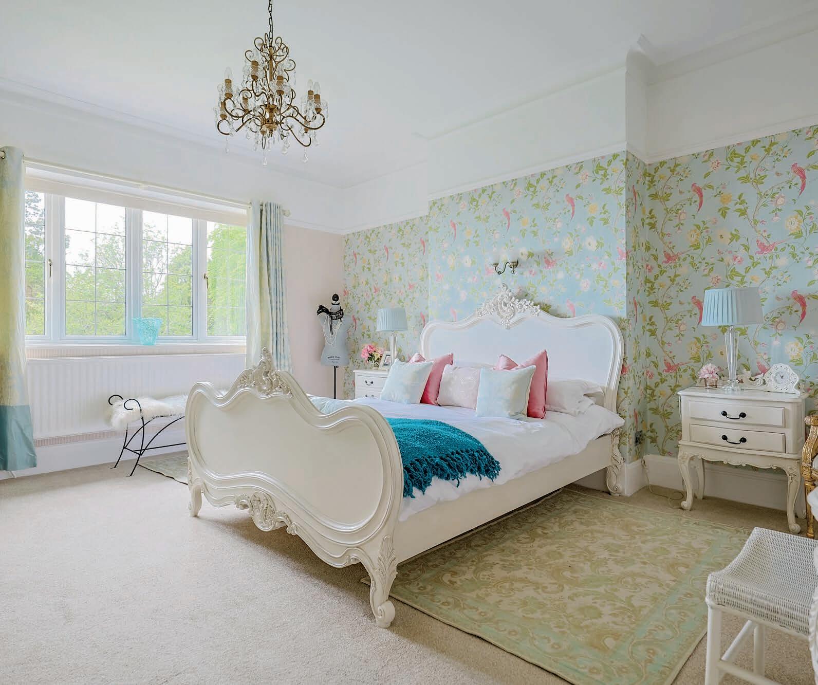 Another beautiful double bedroom with superb views. This naturally bright room features carpeting, high ceilings with coving, a plate rail, and a wash basin.
