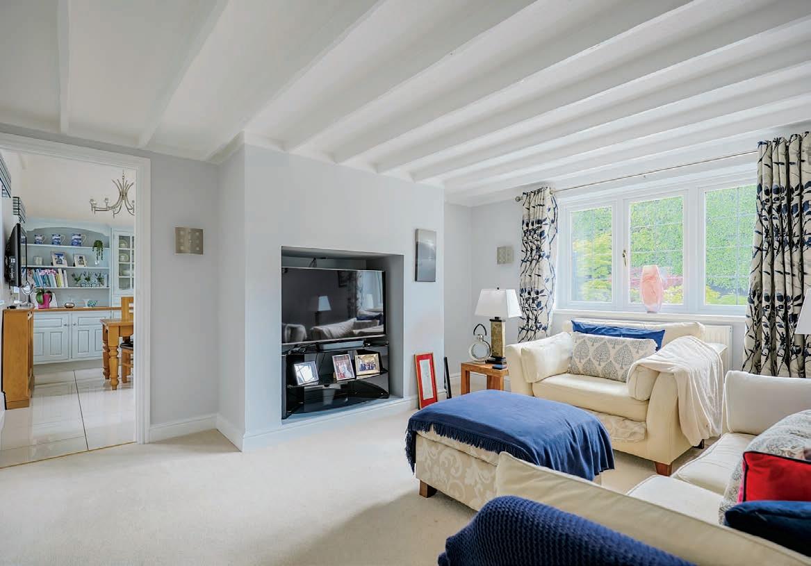 The family room is cosy and super bright, with a window to the side offering views of the immaculate patio area. This space offers carpet, features ceiling beams, and access to the kitchen/breakfast room.