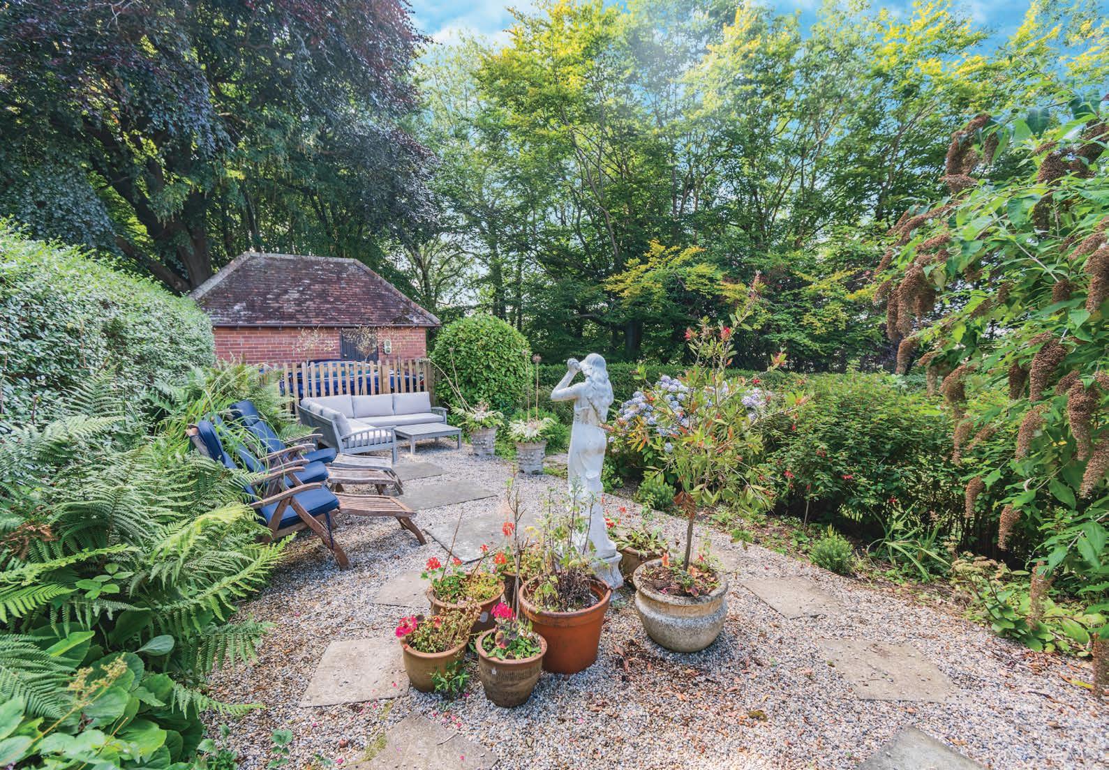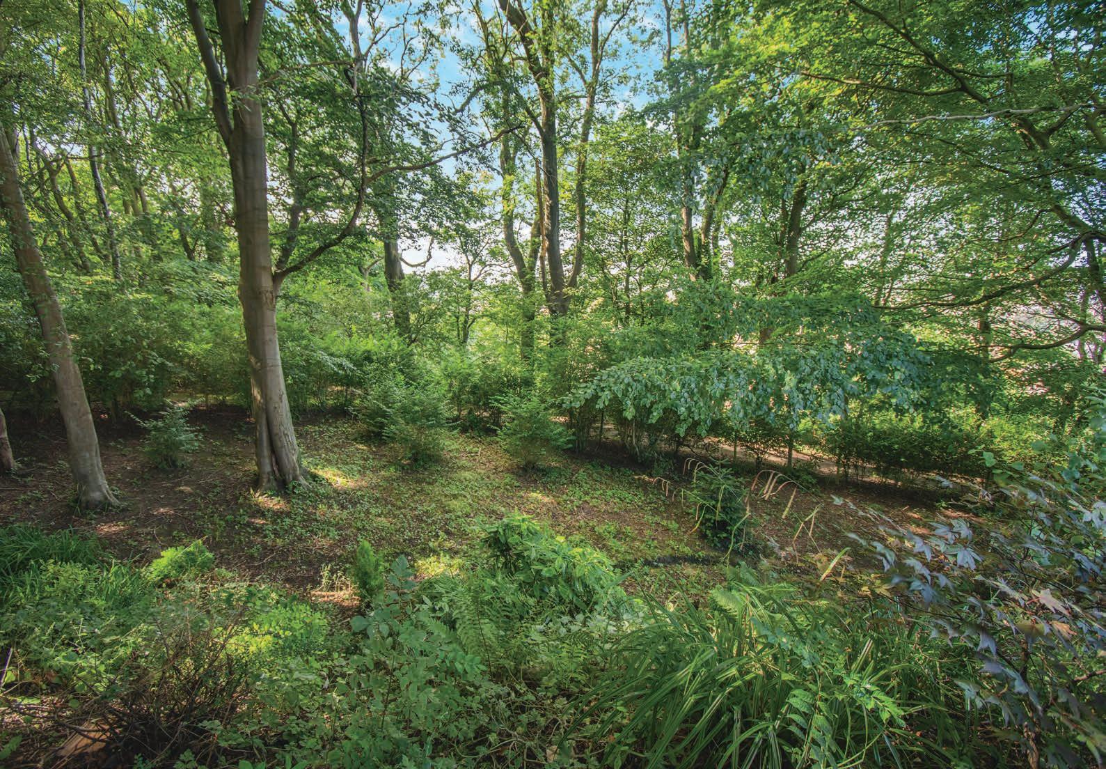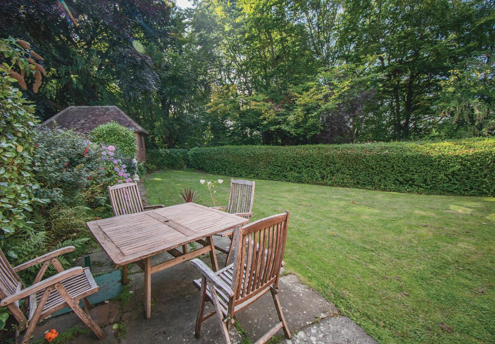 The property is set amidst beautifully landscaped gardens, offering a combination of lawned areas and a vegetable plot with greenhouse. A paved patio area is perfect for evening entertaining, while the surrounding woodland area provides a private and serene environment ideal for those with teenage children. A generous driveway accommodates multiple vehicles, complemented by a detached garage for additional parking and storage.