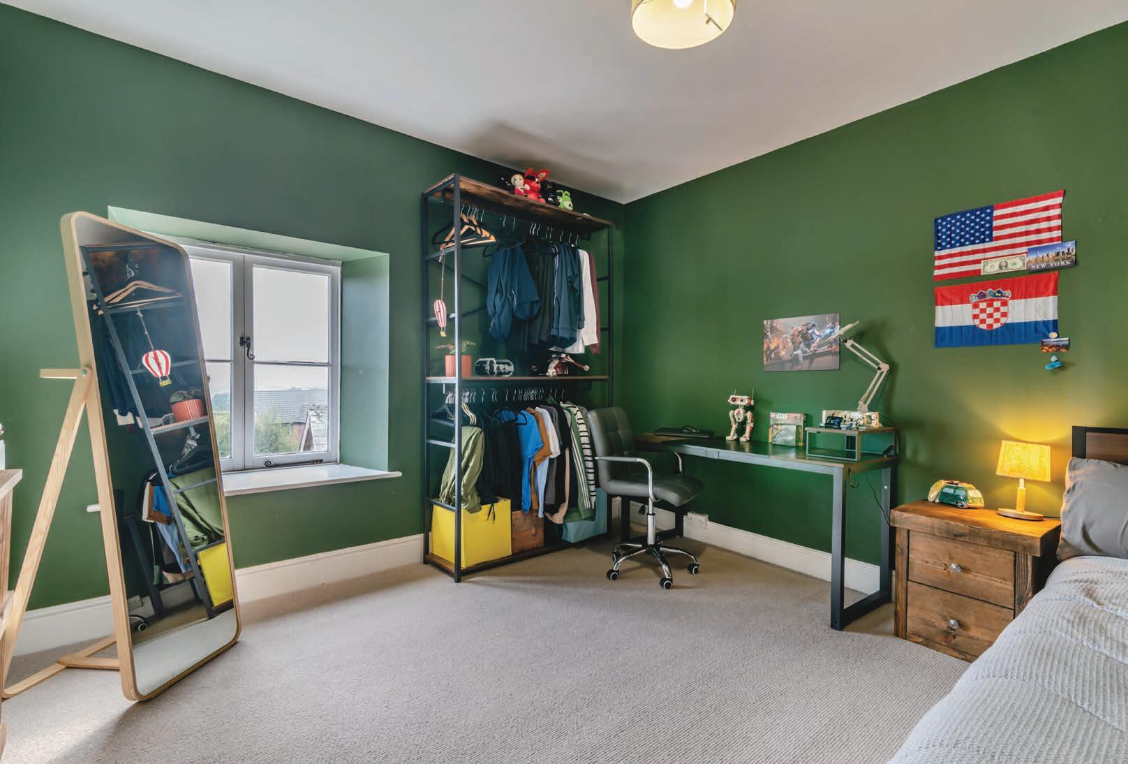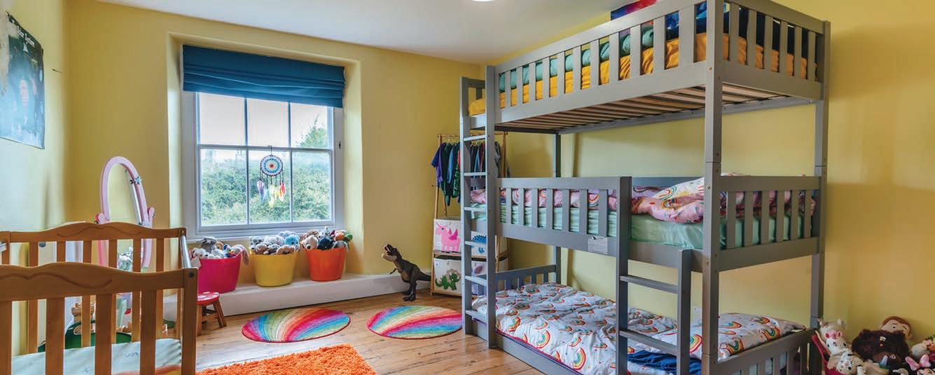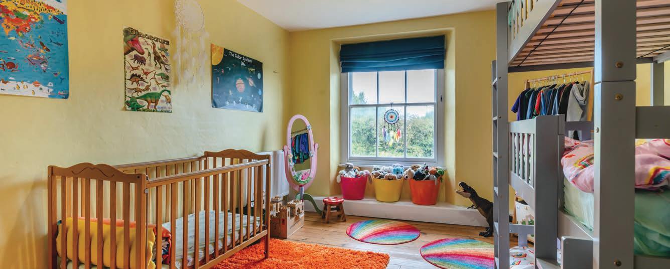 The staircase ascends to an impressive landing with vaulted ceilings and Velux-style windows that flood the space with light. A window at the end of the landing frames a beautiful view of the garden and surrounding land. The first floor comprises five double bedrooms, with the principal bedroom featuring an en-suite cloakroom. The family bathroom was newly installed at the end of 2023.