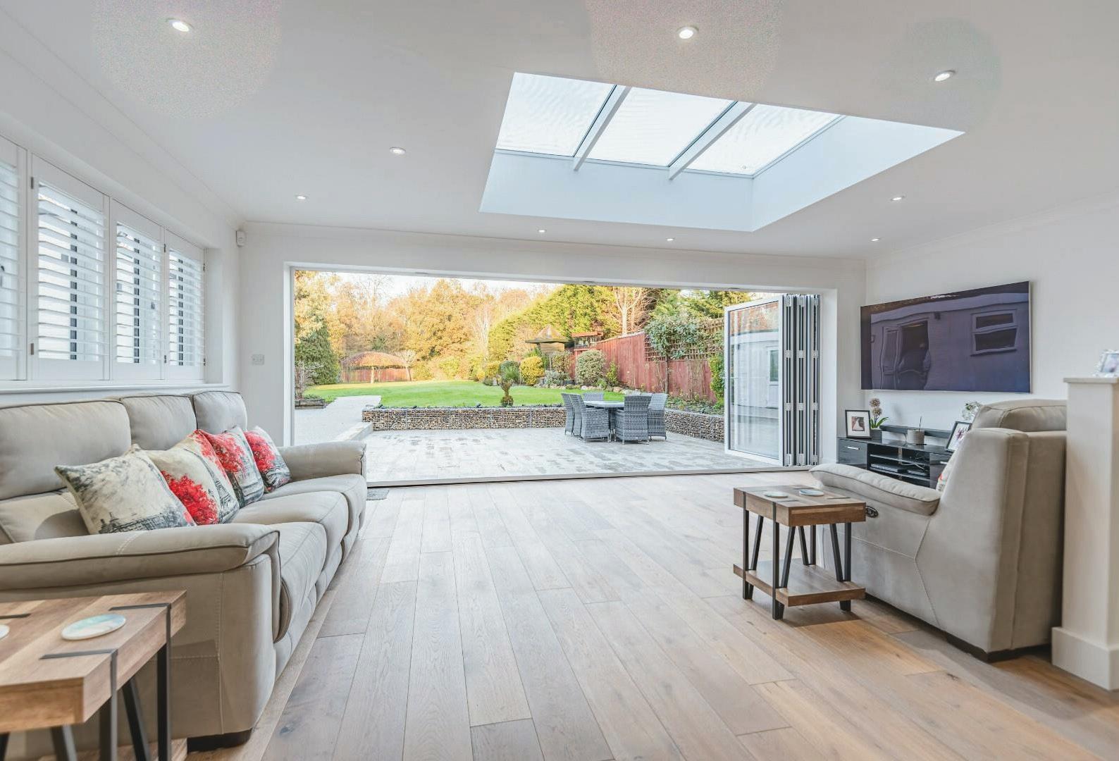 To the ground floor there is an entrance Vestibule leading to the bright entrance hall, to the right of this is the formal living room. Leading of the left hand side of the hallway is a Cinema / Family room which is a great size to add to the living accommodation, the left wing of the house is designated to the Study, Boiler Room and a downstairs Shower/ W.c. The Kitchen / Breakfast / Dining Area gives access to the basement and to the family entertainment space that overlooks the garden via wall to wall Bi-folding doors. The utility room has sufficient space and further storage for the kitchen. The substantial garden has an outbuilding perfect for multiple uses (Gym, Tv room, Office) with power. The rear garden is secluded with high trees boasting a sense of privacy when in the Garden.