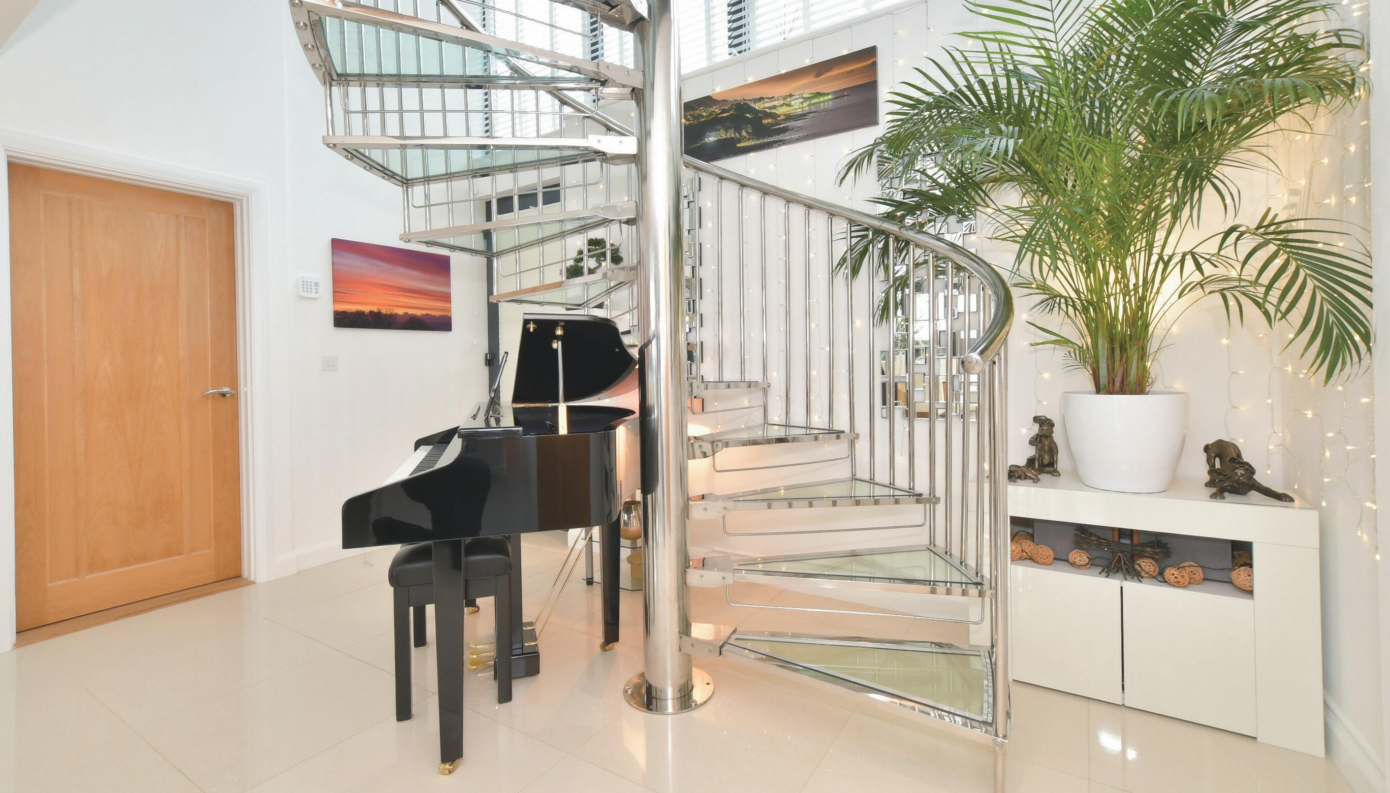 It opens into a wide lobby, with plenty of storage for coats and boots and leads to the superb sitting/dining room, that includes a fascinating spiral staircase to the first floor and porcelain tiles with underfloor heating, that flows throughout the house. At the other end of this room, there are bi-fold doors to the decked terrace, so you can always bring the outside indoors on a sunny day. An open archway leads to the attractive kitchen/breakfast room with gloss red units and white Corian worktops, housing an American fridge freezer, range cooker and a dishwasher, as well as a white central island/breakfast bar. It also has a door to the garden and another to a single bedroom, that could also make an excellent study for anyone working from home. This floor also includes a utility room and a light and bright, triple aspect double bedroom, with an en suite shower.
