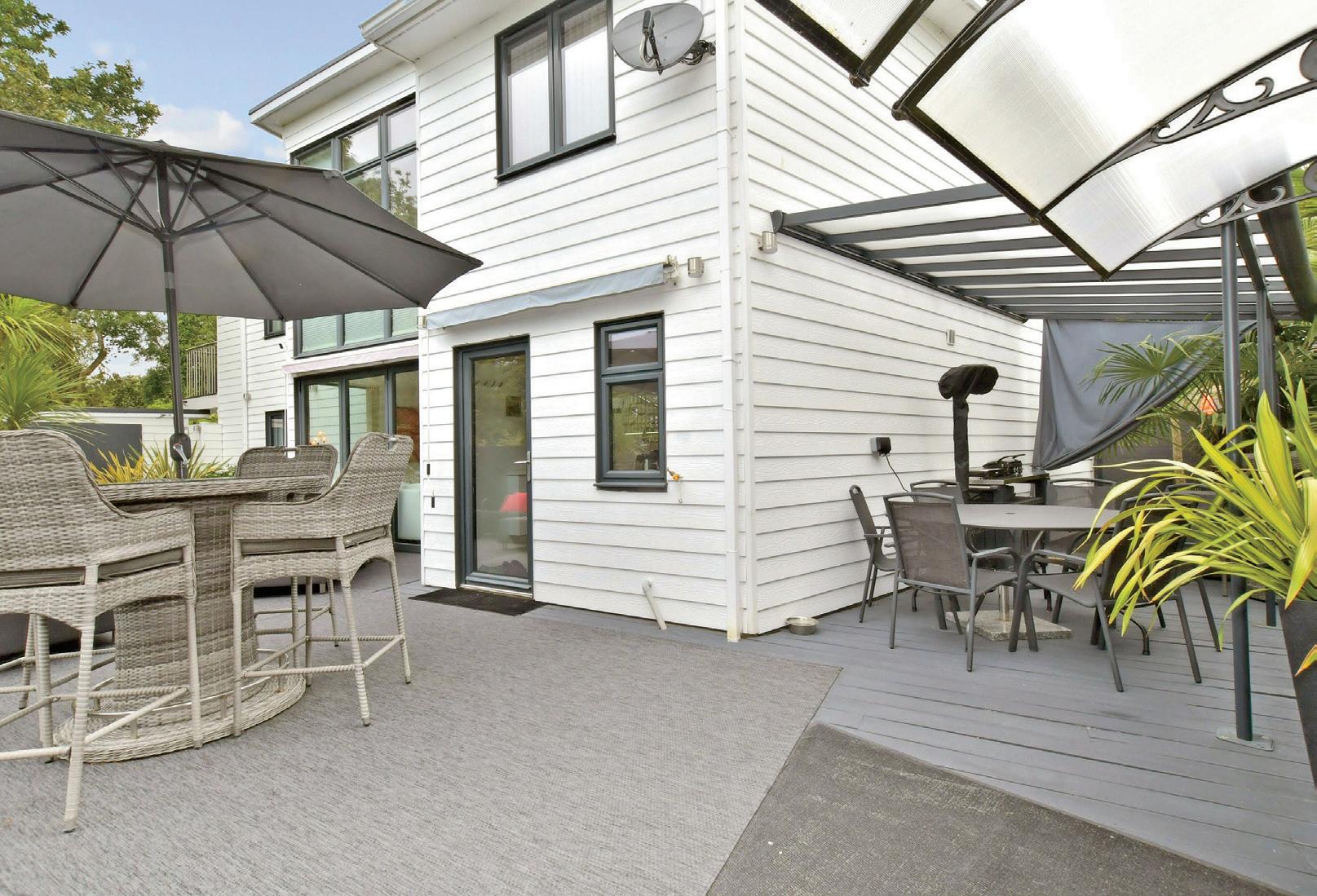 Outside the block paved driveway provides off road parking for three cars and leads to the garage/cycle store. The low maintenance, non-overlooked, secluded garden, includes decked terraces with delightful sea views and two useful outbuildings, as well as sub-tropical planting, that enjoy the local micro-climate.