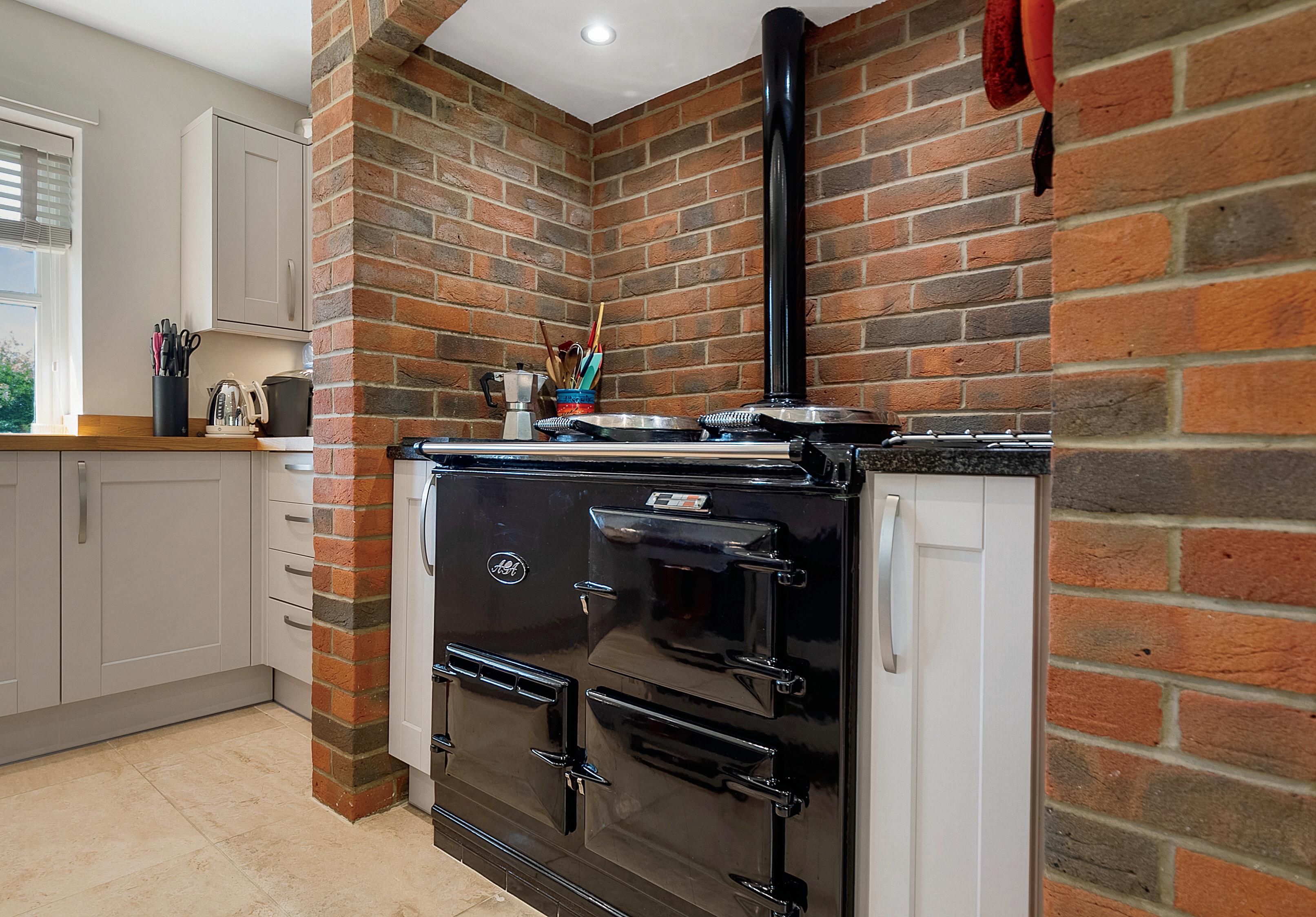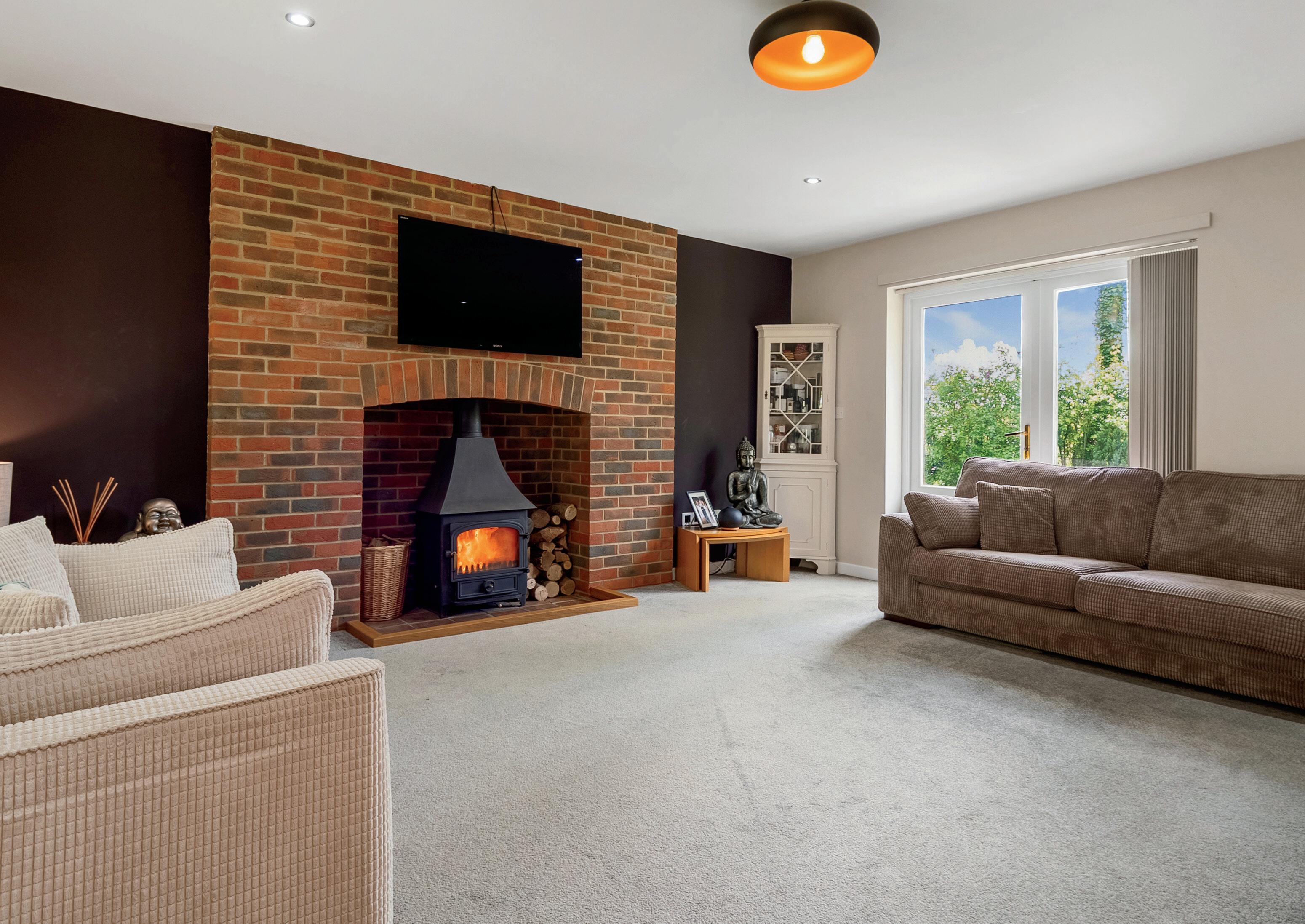 There’s a welcoming hallway leading to all living spaces, featuring a ceiling light box for natural illumination, a cloaks cupboard and quality oak doors leading to the primary rooms and bedrooms. The generous open-plan kitchen has an Aga, ample cabinetry, Belfast sink, and space for family dining, with access to both lounge and entrance hall and delightful views of the grounds. The spacious sitting room is a dual-aspect room with an exposed brick fireplace housing a log burner, and patio doors opening onto a southerly facing paved patio area. The utility room is just off the hall, with appliance provisions, sink unit, and cupboard space, overlooking the rear of the property.