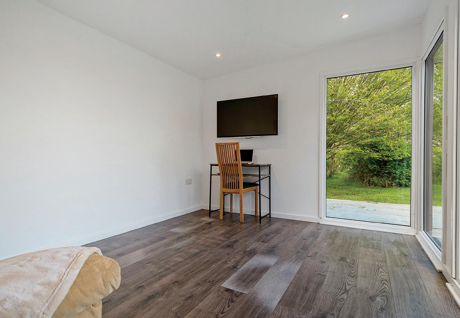 The property occupies a plot of 1.47 acres with a gated gravelled drive, offering picture perfect views of the fields as you arrive. There is ample parking and a detached double garage with electric doors and a steel framed workshop with electric roller doors, neighbouring the garage. The stunning gardens are bordered by a pretty stream on the northern boundary and have extensive wraparound lawns, a south facing patio area, and sloped disabled access to the front door, offering stunning views in a secluded setting. The rear gardens are dedicated to lawns and young trees, providing an attractive woodland setting. The recently constructed office offers the perfect retreat for a ‘work from home’ environment.