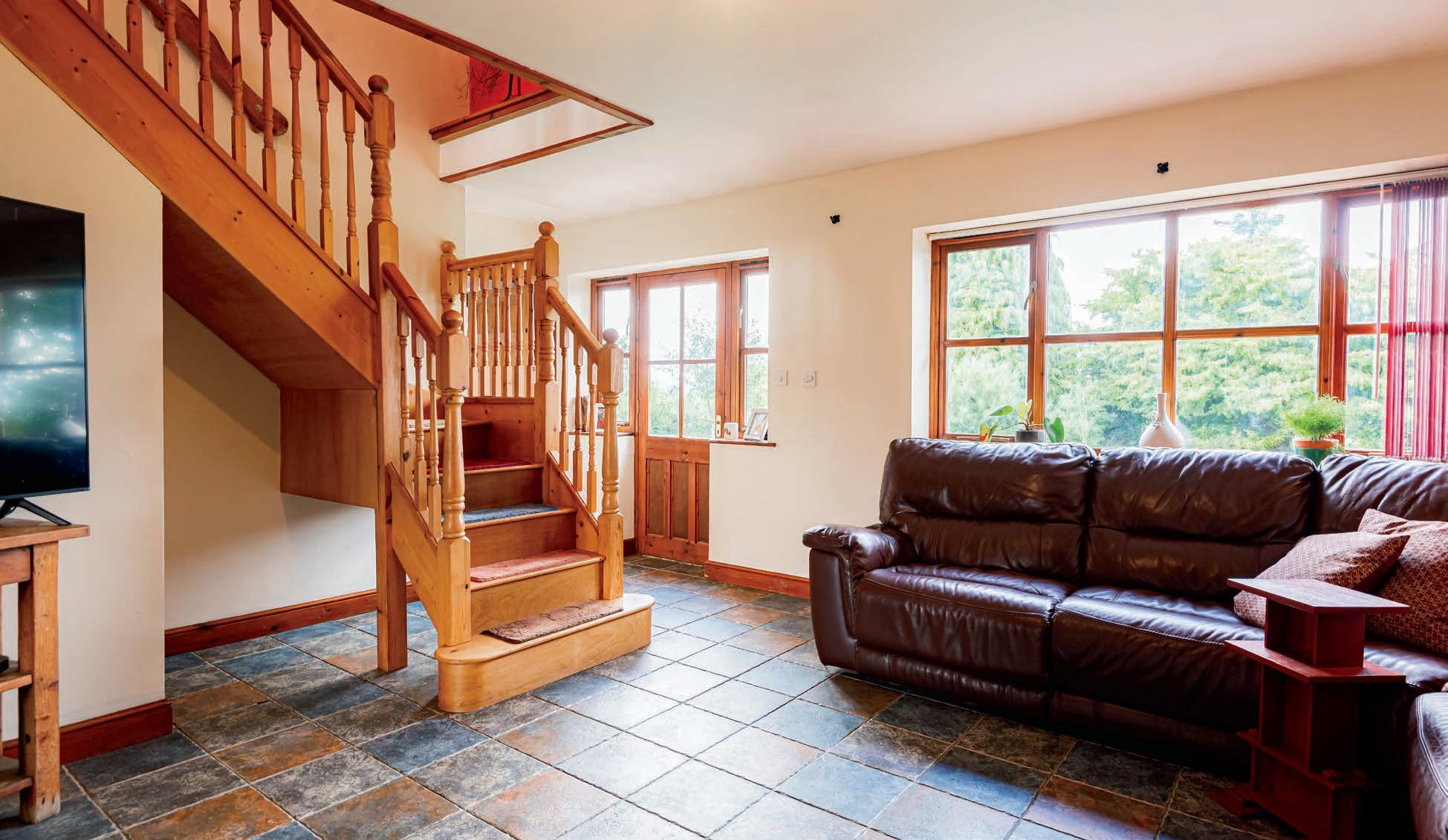 Living Room: Feature fireplace with wood burning stove, fantastic countryside views, tiled floor.