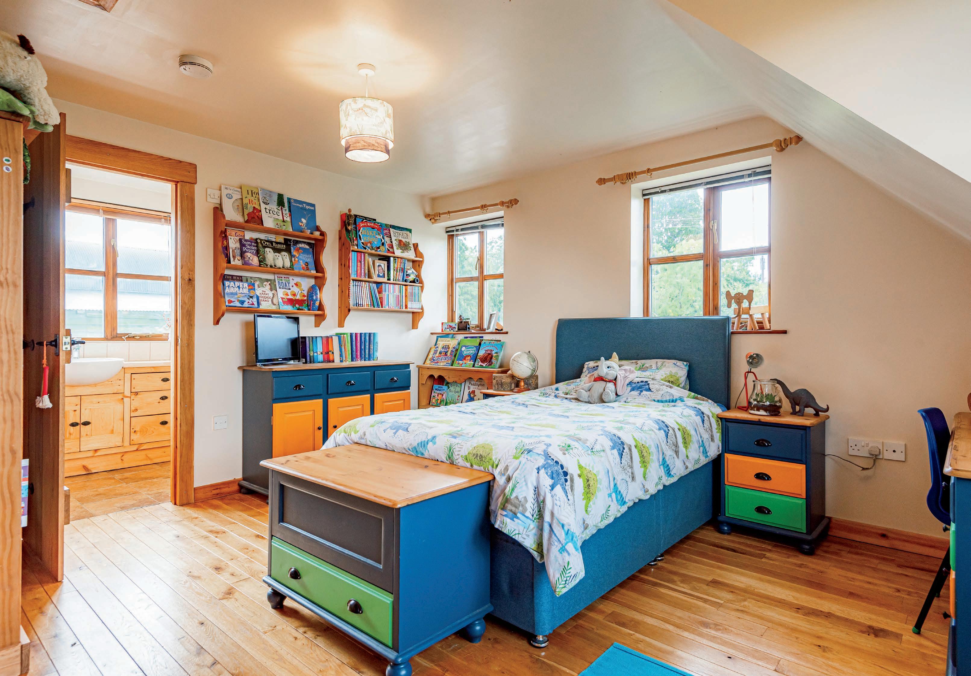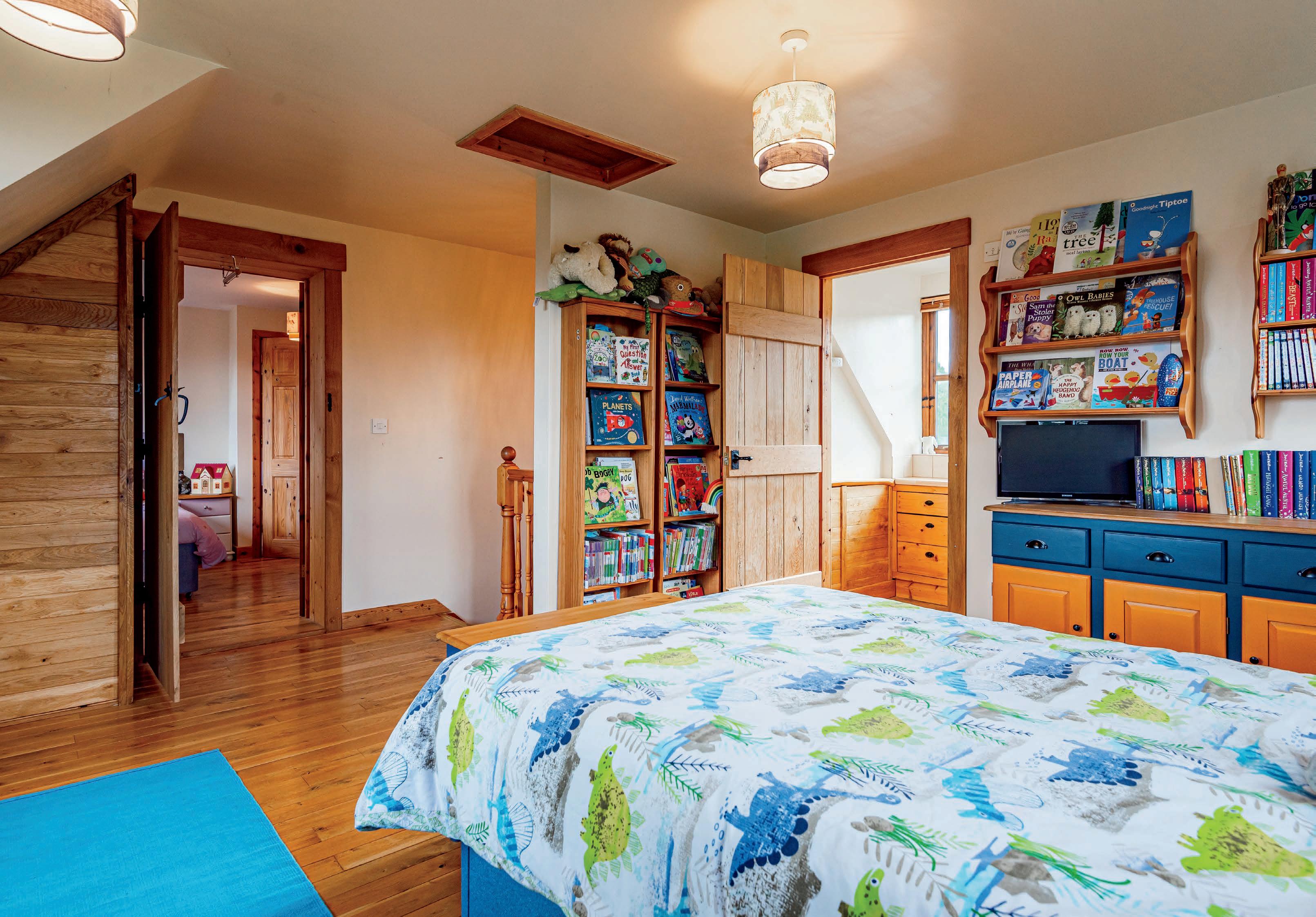 Bedroom One: Wood floor, radiator, countryside views, built in storage rails and shelves, feature hobbit doors into eaves storage.