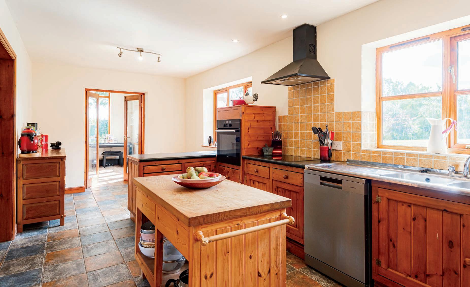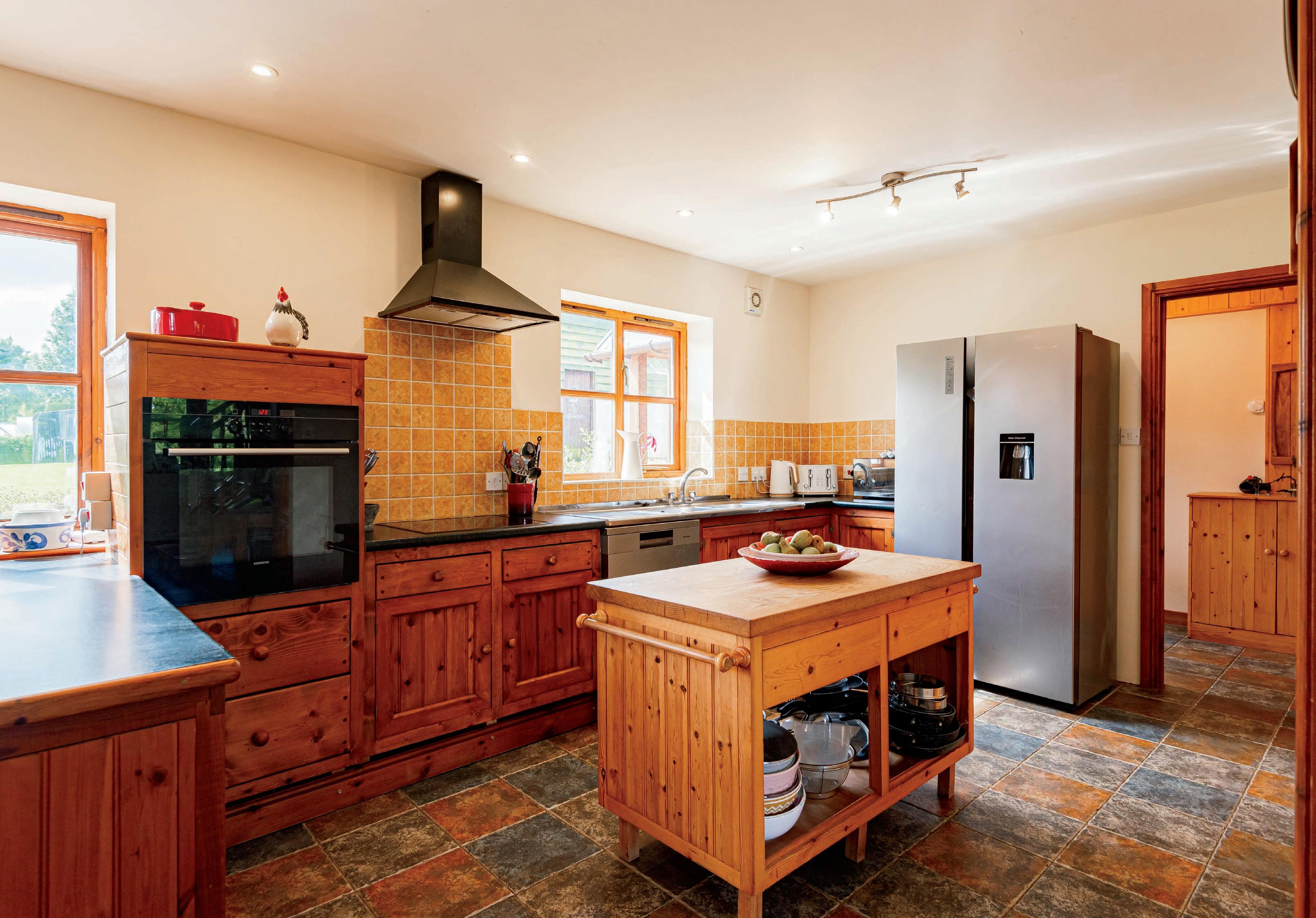 Kitchen Breakfast Room: A range of wall and base units, work surfaces tiled floor, space for fridge freezer, pantry cupboard, built in hob and extractor, built in dishwasher, sink and drainer, countryside views.