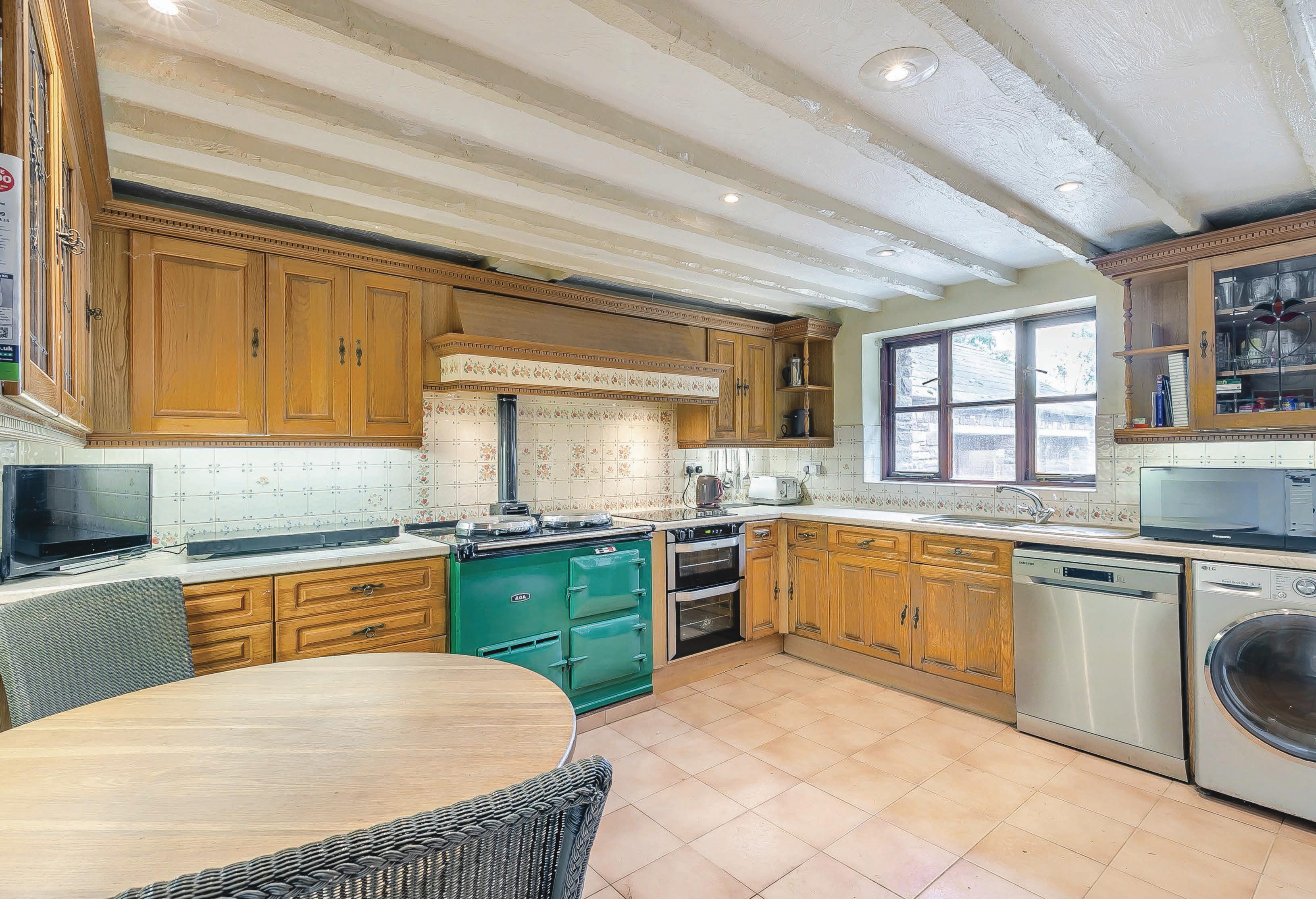The main barn features a spacious lounge/diner, a country-style kitchen with an Aga, and a convenient cloakroom. Upstairs, the master bedroom benefits from an ensuite (currently being refurbished) and fitted wardrobes. Two additional double bedrooms— one with fitted wardrobes—and a family bathroom complete the upper floor.