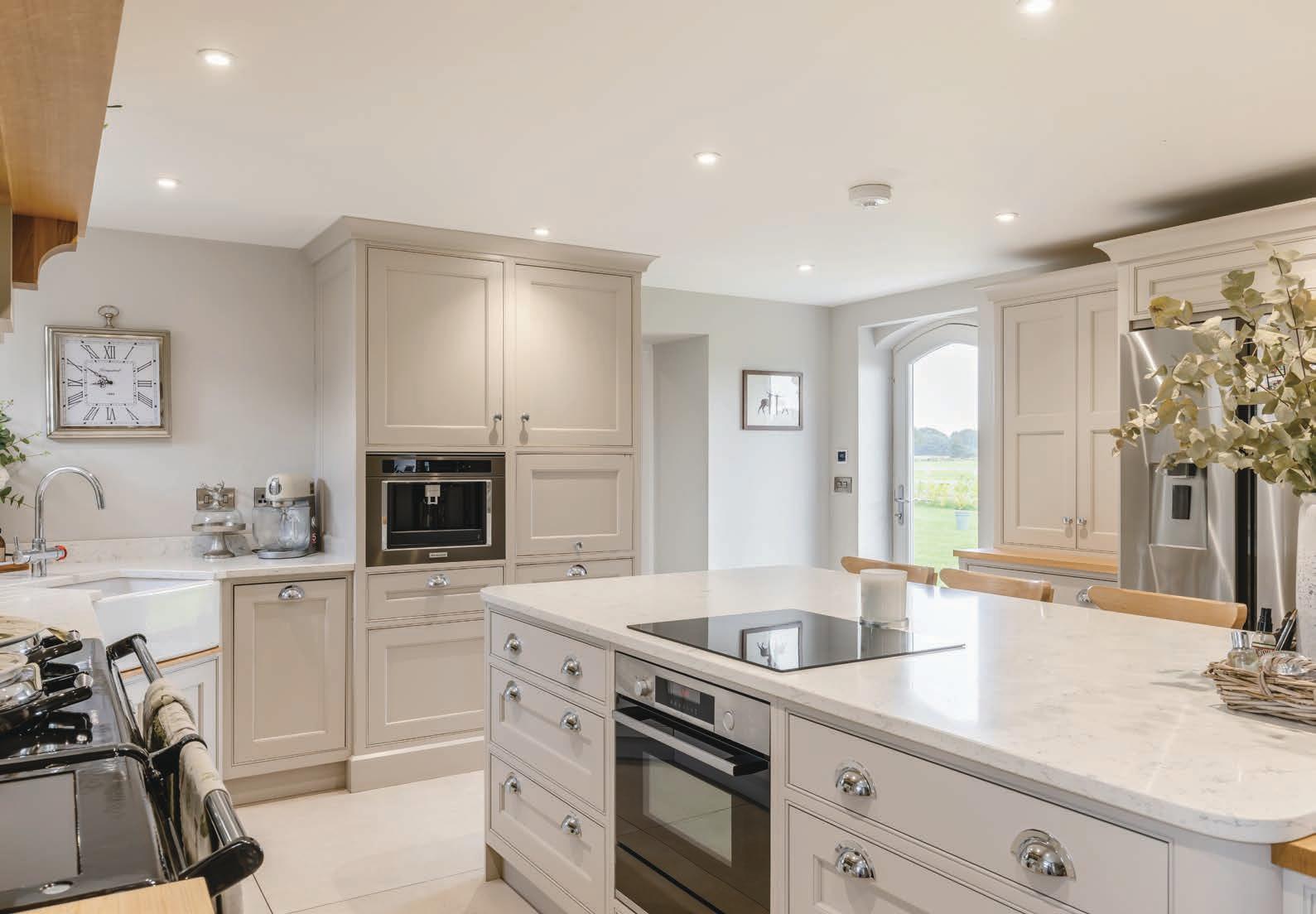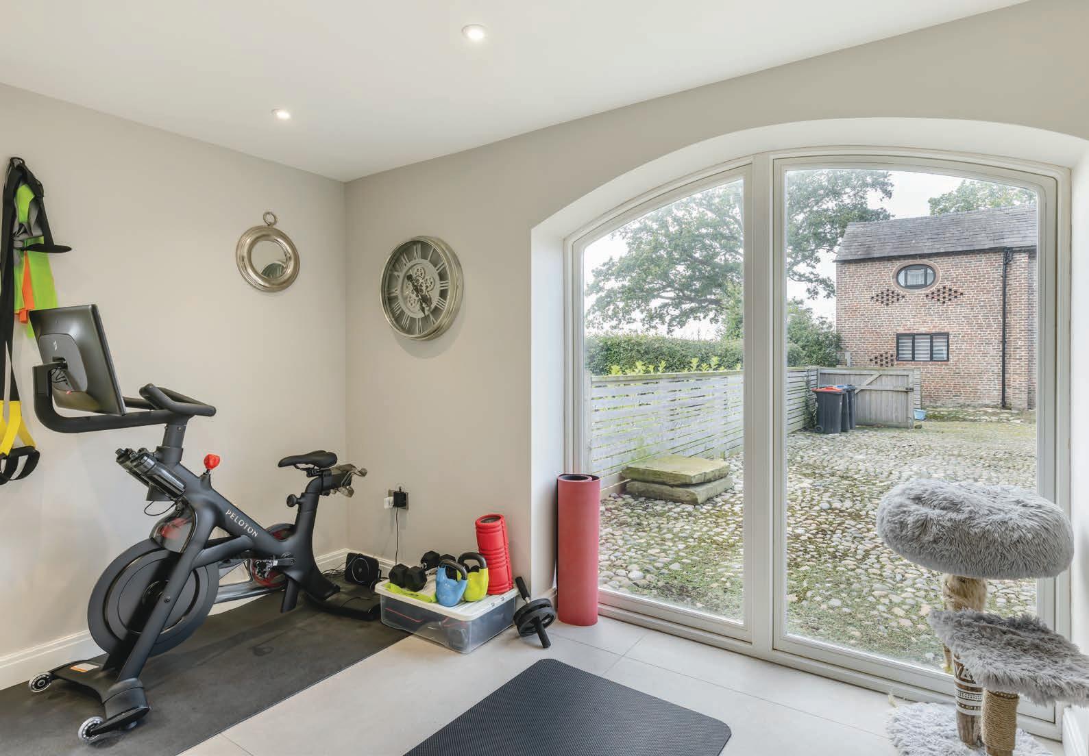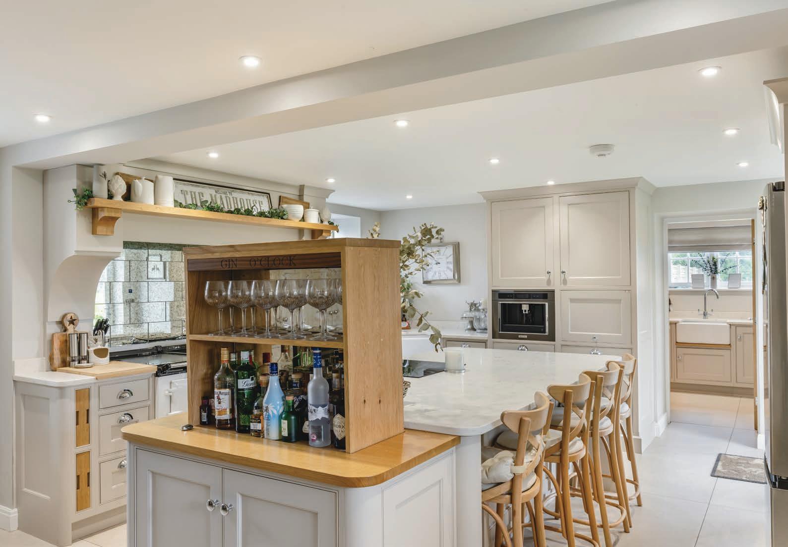 Luxury Accommodation The heart of the home is the expansive open-plan living and dining kitchen, where dual aspects reveal charming views of the courtyard and formal gardens. The bespoke handpainted cabinetry and large central island topped with white marble make this kitchen a culinary masterpiece. A pop-up bar with an electric motor and a solid oak counter adds a unique touch, while the electric Aga set in a chimney breast with traditional hobs and a plancha hot plate ensures a firstclass cooking experience.