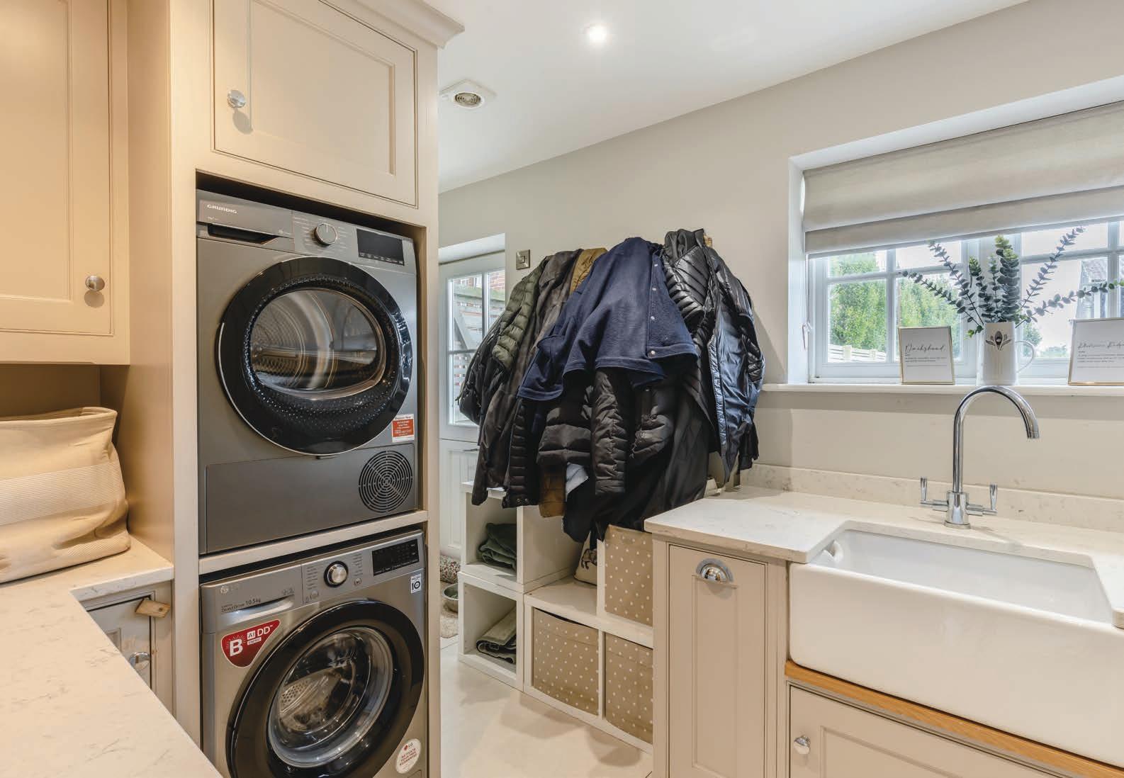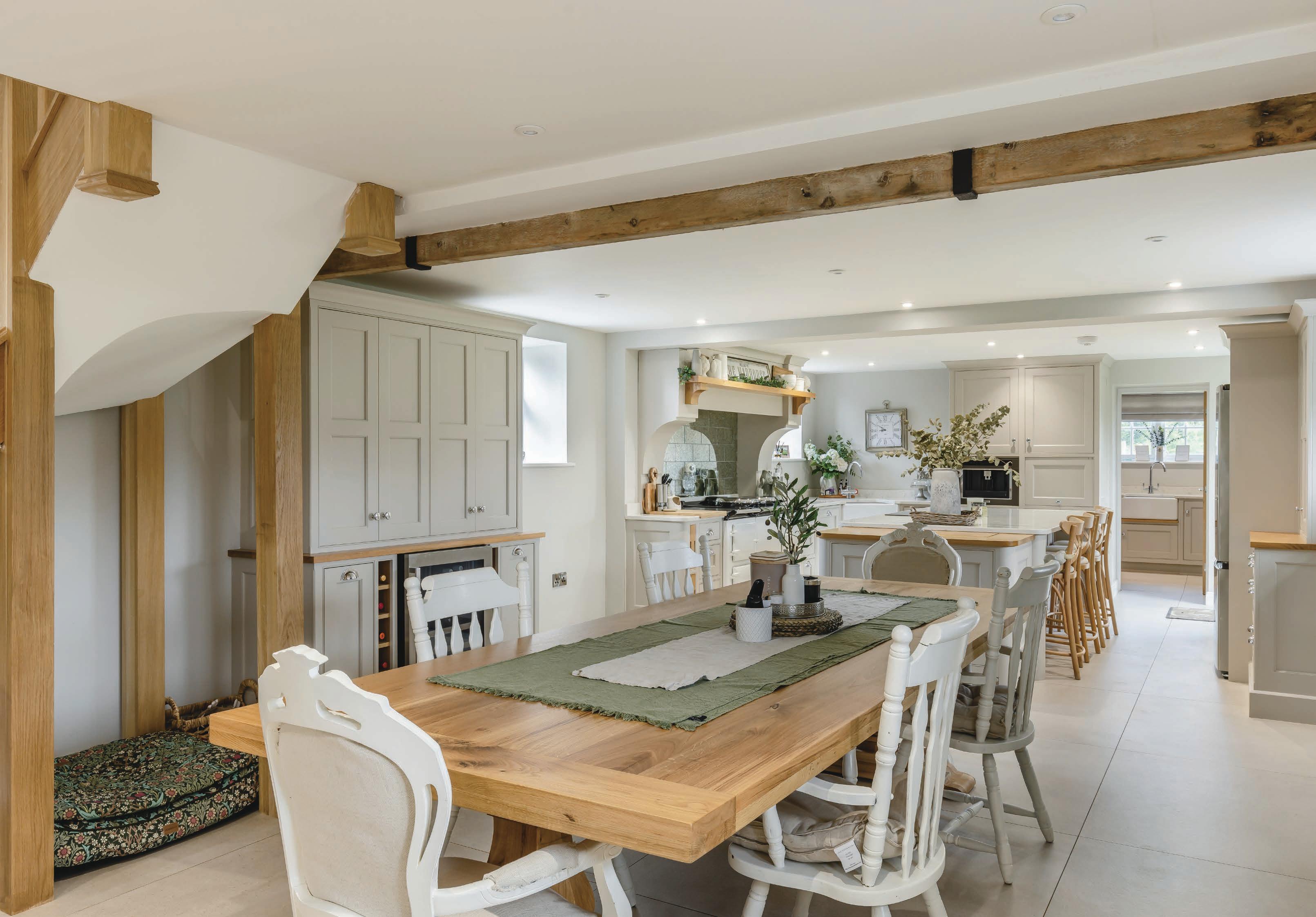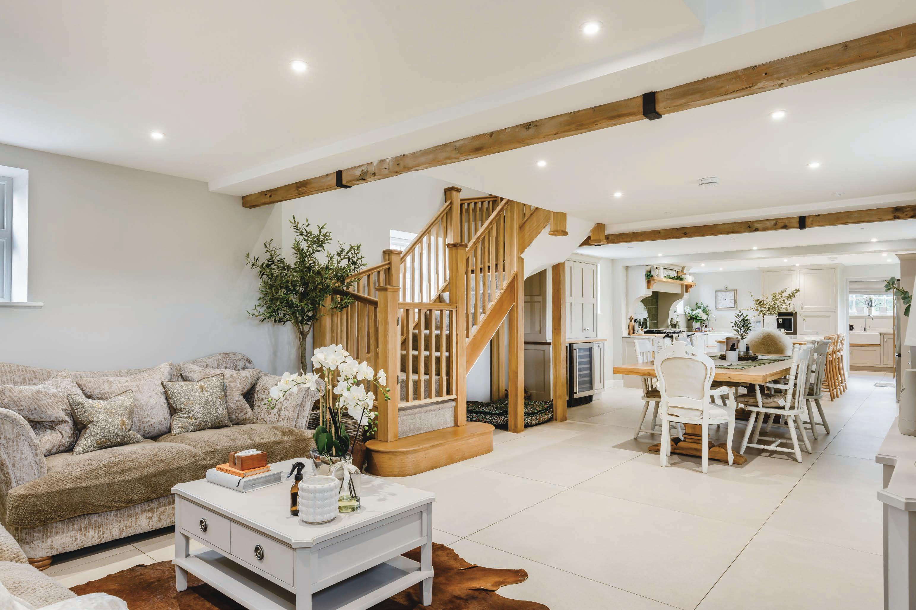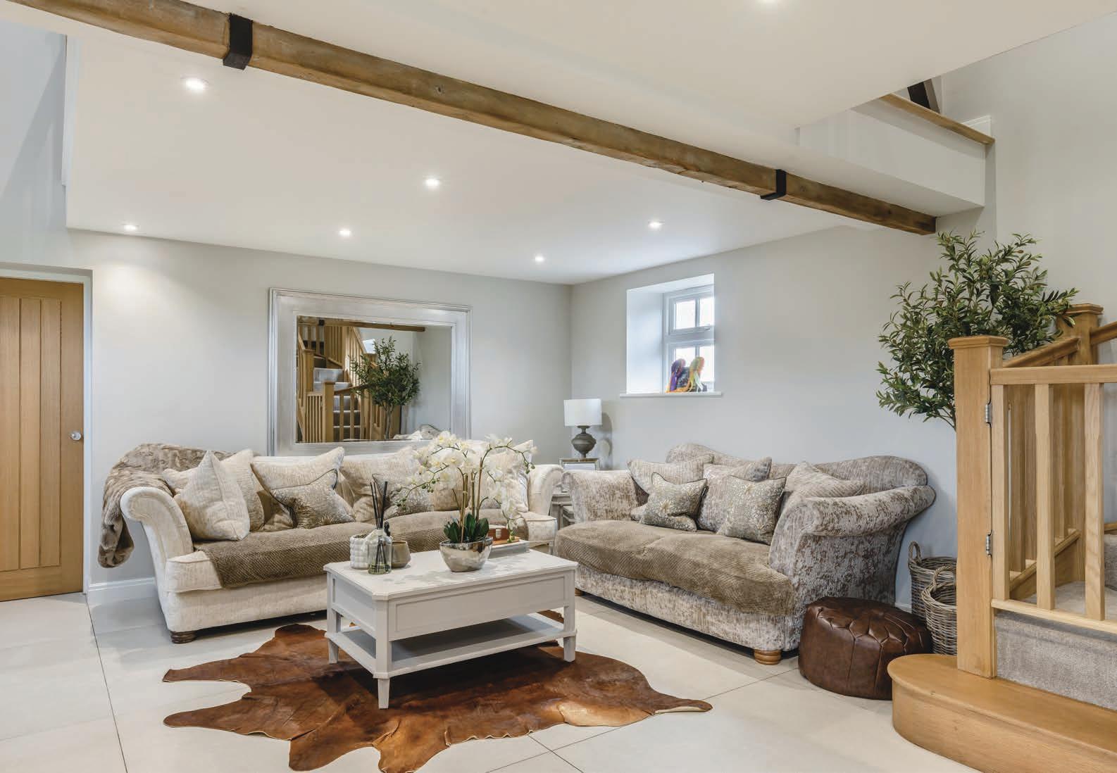The kitchen flows seamlessly into a spacious family room and dining area, all framed by elegant oatcoloured tiling. From here, a solid oak staircase leads to the first-floor landing.