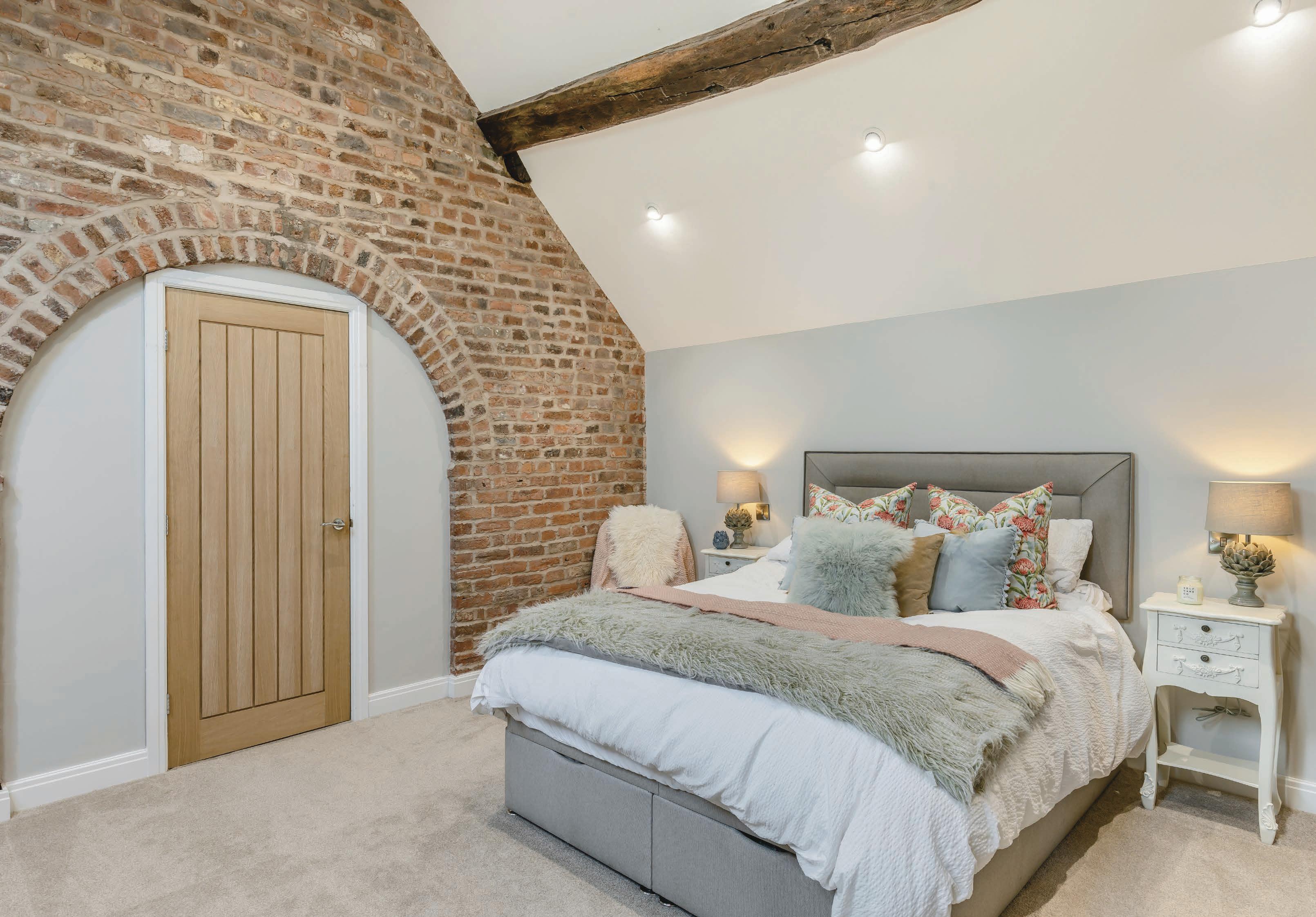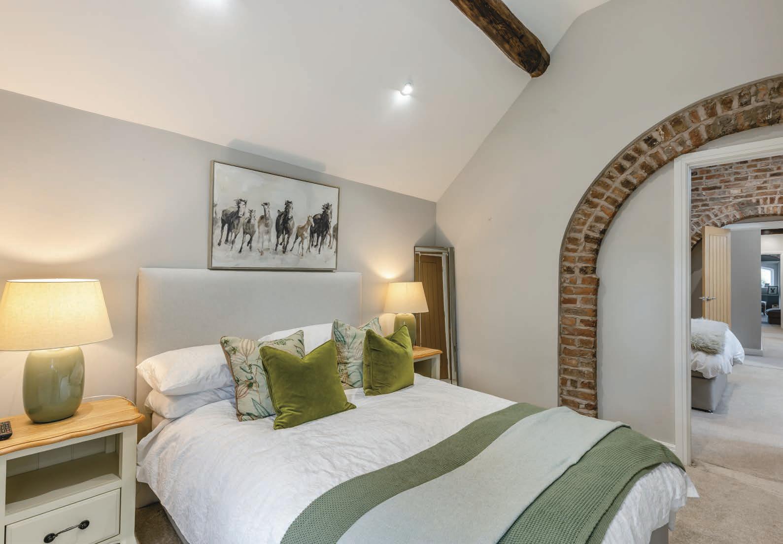 Elegant Bedrooms and Bathrooms On the first floor, all four bedrooms benefit from vaulted ceilings and exposed structural timbers, creating a sense of rustic grandeur. The master suite is a true sanctuary, featuring a dramatic exposed brick archway leading to a spacious dressing room. The en-suite bathroom is finished to the highest standard, with a fully tiled shower enclosure, overhead rain shower, Corian wall-hung wash basin, and a low-level WC.