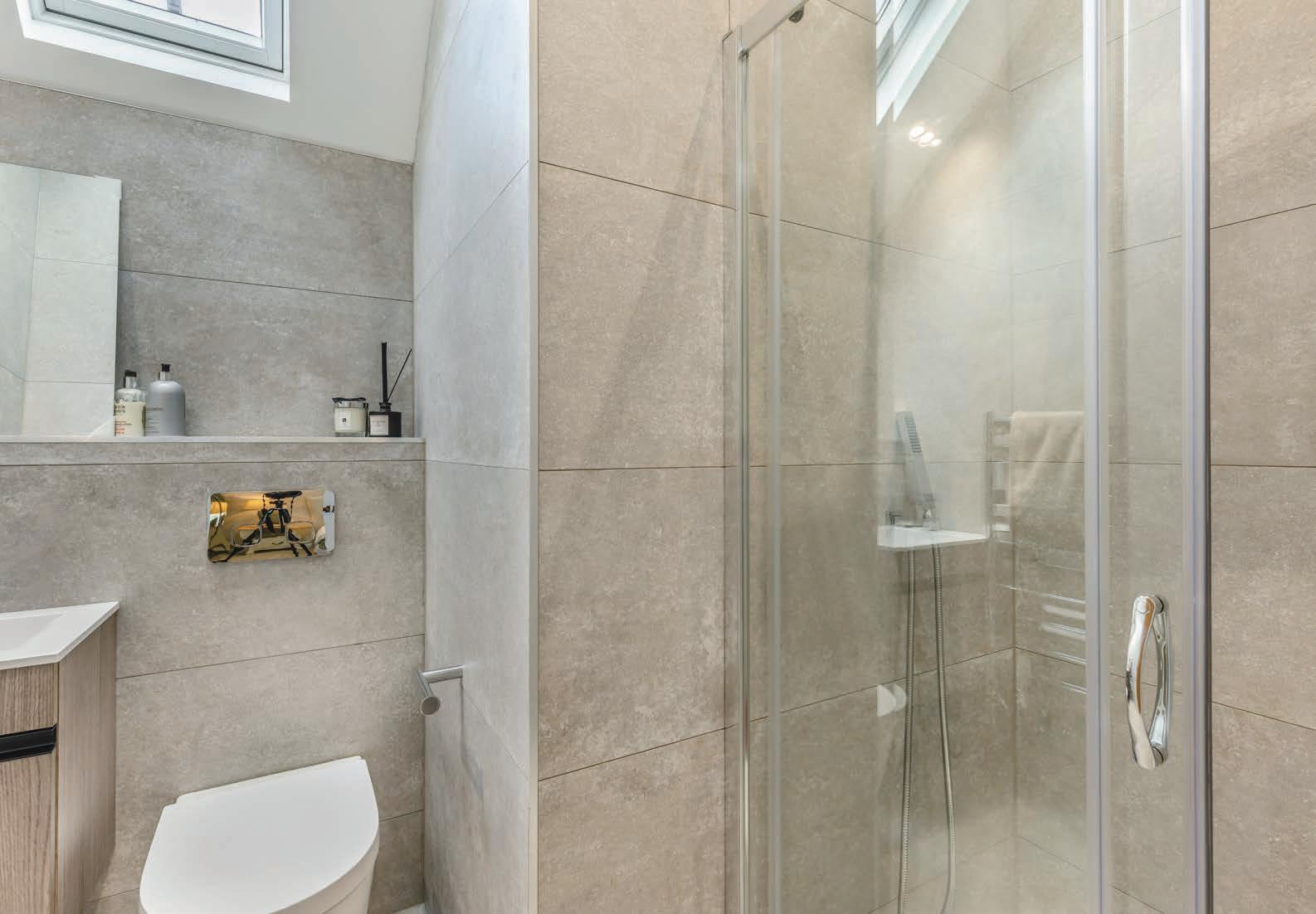 The family bathroom, located off the central landing, is an epitome of contemporary elegance, with a tiled-panel bath, overhead shower, concealed cistern WC, and a Corian wash basin set above floating drawers and matching wall cabinets.