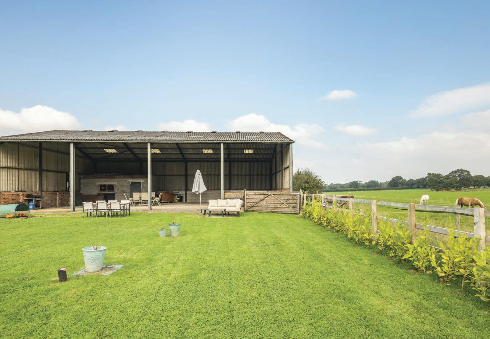 The approach to the property is as impressive as the residence itself, with secure double gates opening onto a sweeping gravel driveway that provides ample parking, bordered by mature hedging for added privacy. Manicured lawns flank the front and rear of the property, leading to a large, open steel-frame barn – perfect for equestrian or agricultural use.