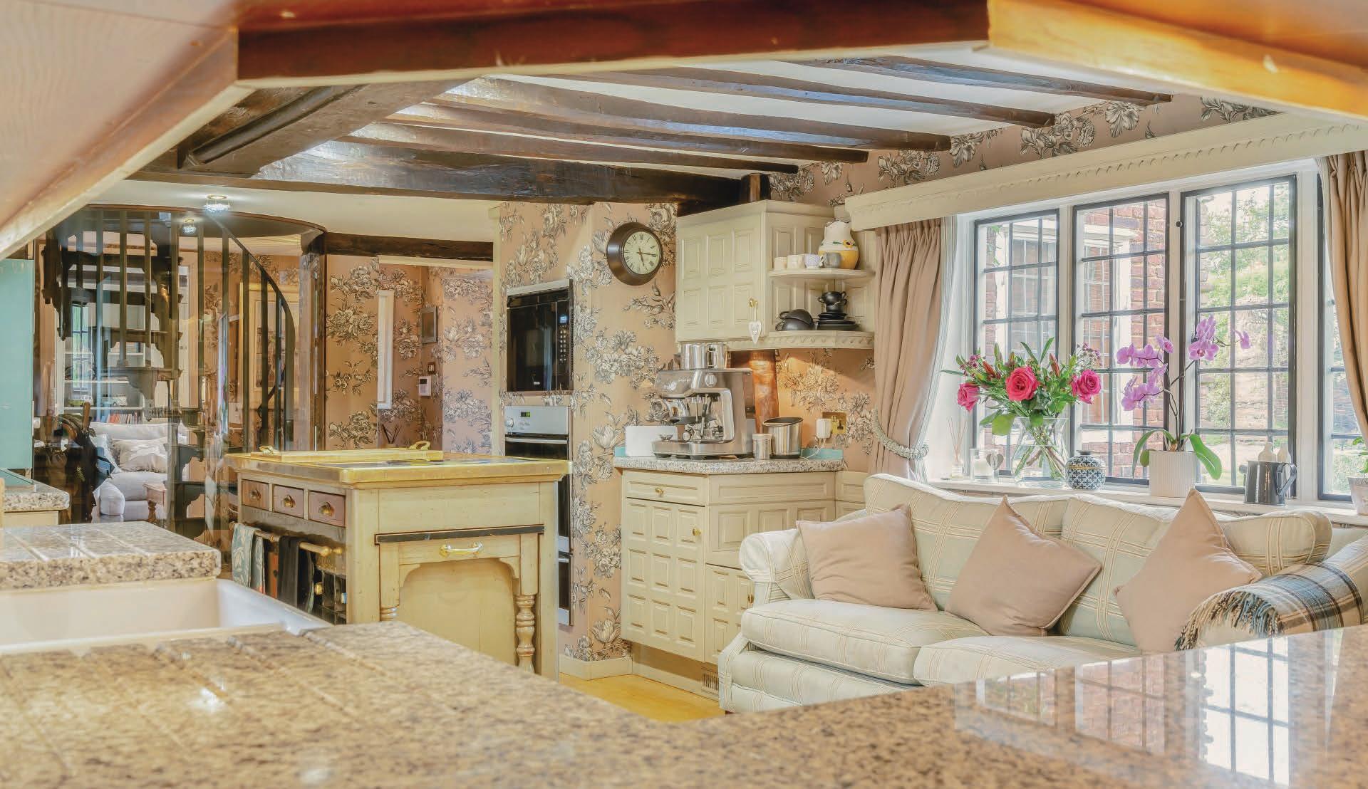 Rurally located about three miles northwest of Beaconsfield and four miles east of High Wycombe, this Grade II listed 17th-century farmhouse and barn were designed and converted into a substantial country house by Edwin Forbes in the Arts & Crafts style between 1911 and 1912. Later additions to the property include an impressive tower and a stone coat of arms. Laid out over two floors, the main house boasts six bedrooms, while a separate cottage offers an optional three or four bedrooms. Set in beautiful, extensive grounds comprising level lawns, a sundial garden, a swimming pool, woodland, an apple orchard and a stable and paddock, the exterior is as impressive as the interior. ‘We fell in love with the house at first sight, despite it needing a lot of work. It’s a beautiful home to look at and in places, it feels much like a palace, but it also has a wonderfully cosy and homely feel,’ say the owners. The house has been meticulously maintained, with annual upkeep of the roof, heating systems and boilers. The cottage was completely refurbished, including a new roof and conservatory and the garage was extended for three cars. A gym was added by converting the original garage and joining it to the cottage. External enhancements include a Hartley botanic greenhouse, a summerhouse, gazebo and significant landscaping. The house has been fully redecorated with updated electrics, new doors, secondary glazing, a repointed south wall and several murals painted by Rosie Mennem. ‘The garden has had extensive landscaping including designs by garden designer Sue Blakely. Features such as the Wisteria, which flowers twice a year and the hue of purples, pinks and blues in June are stunning.’
