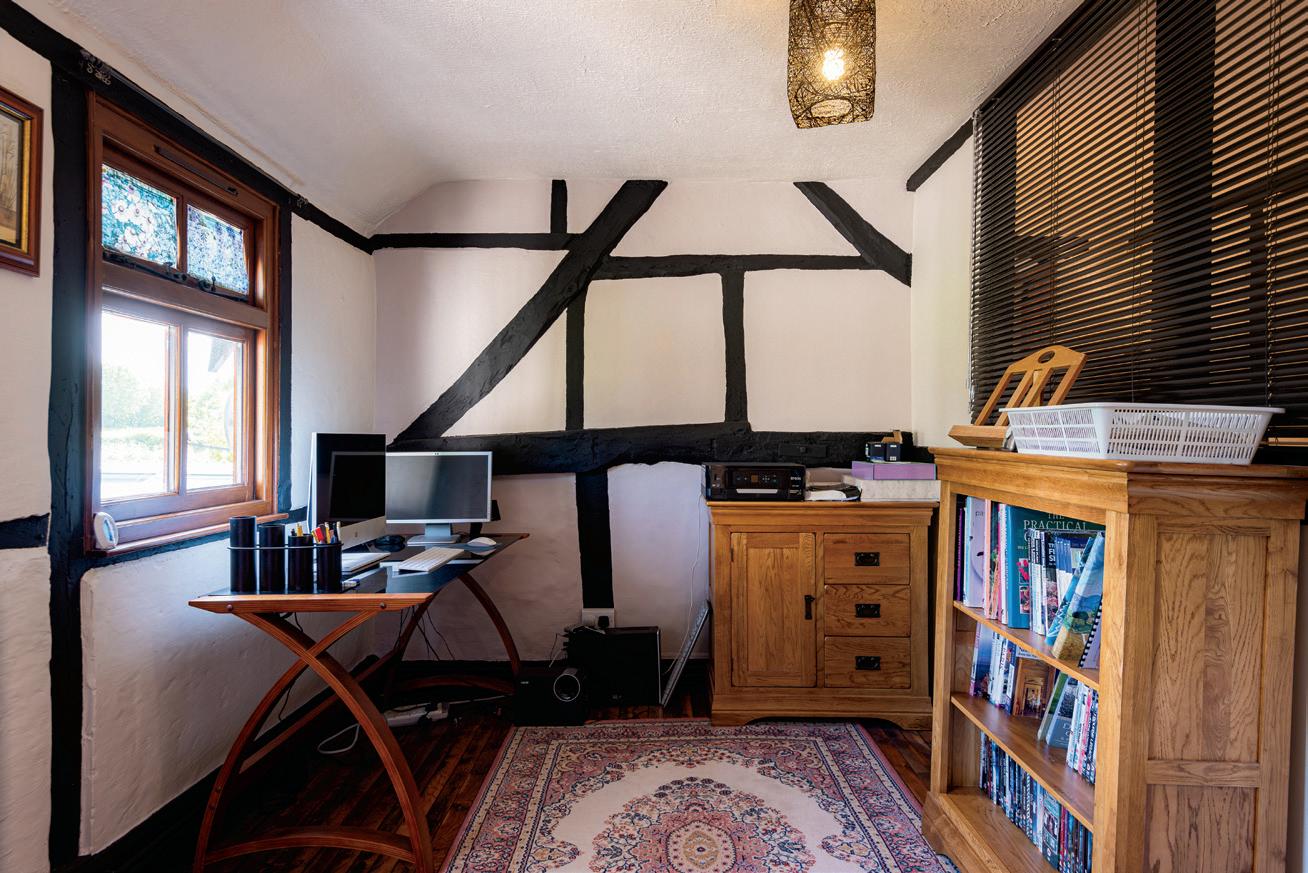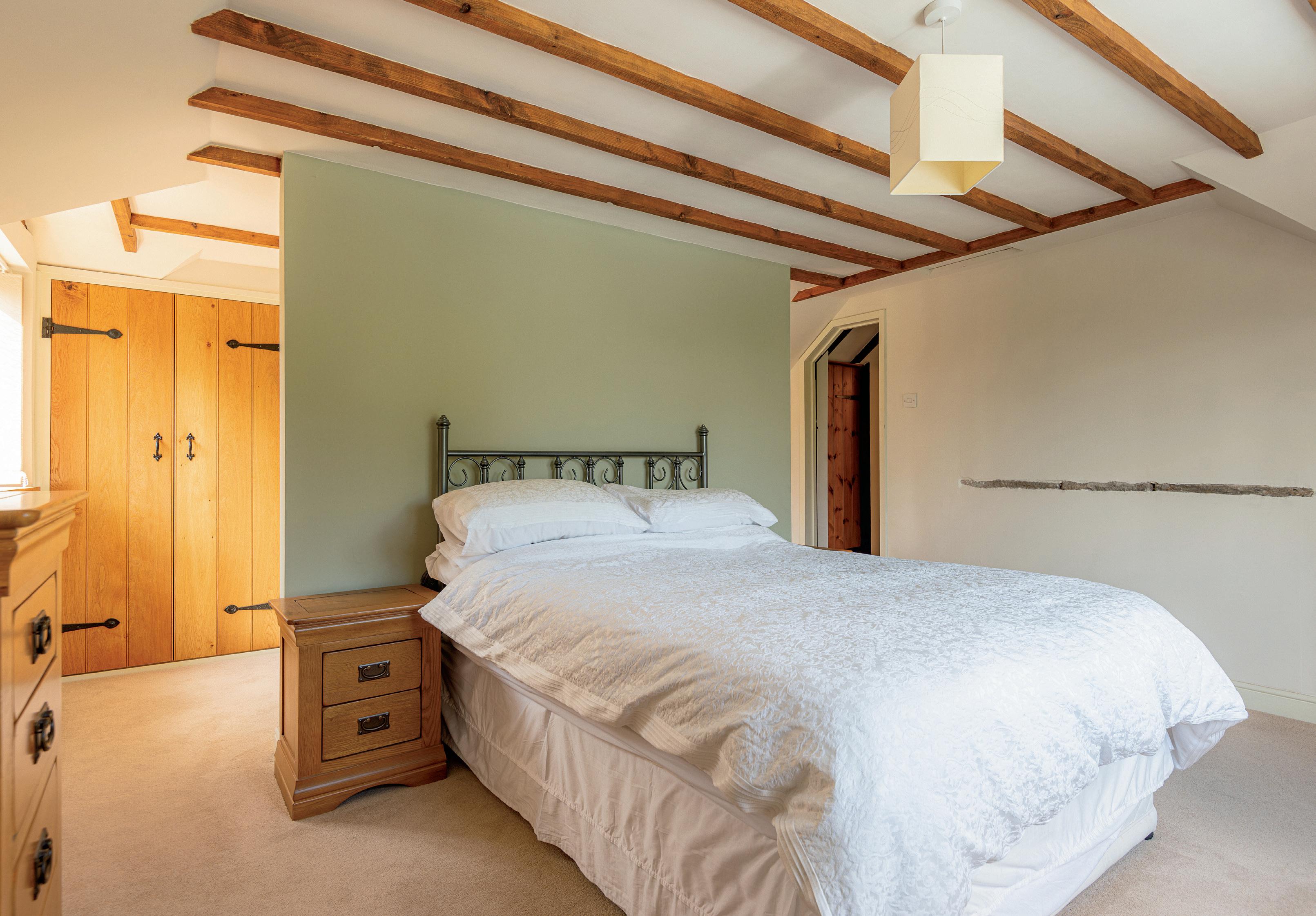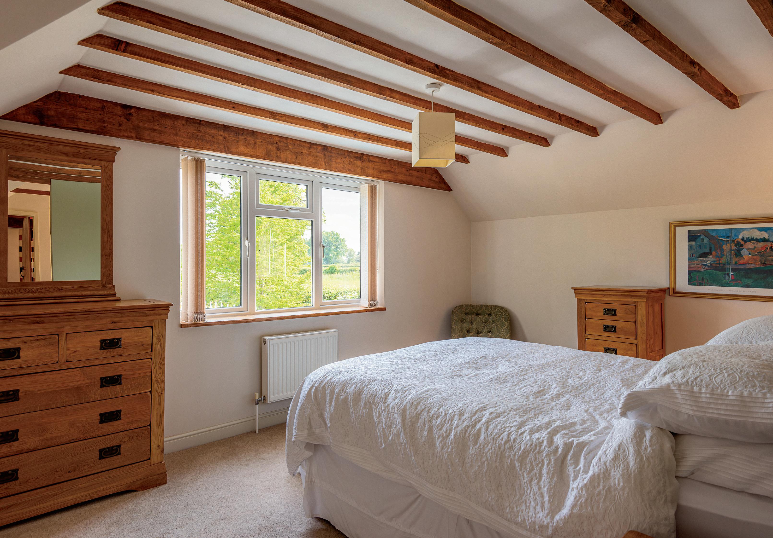 Bedroom Three: Garden views, exposed timbers, radiator.